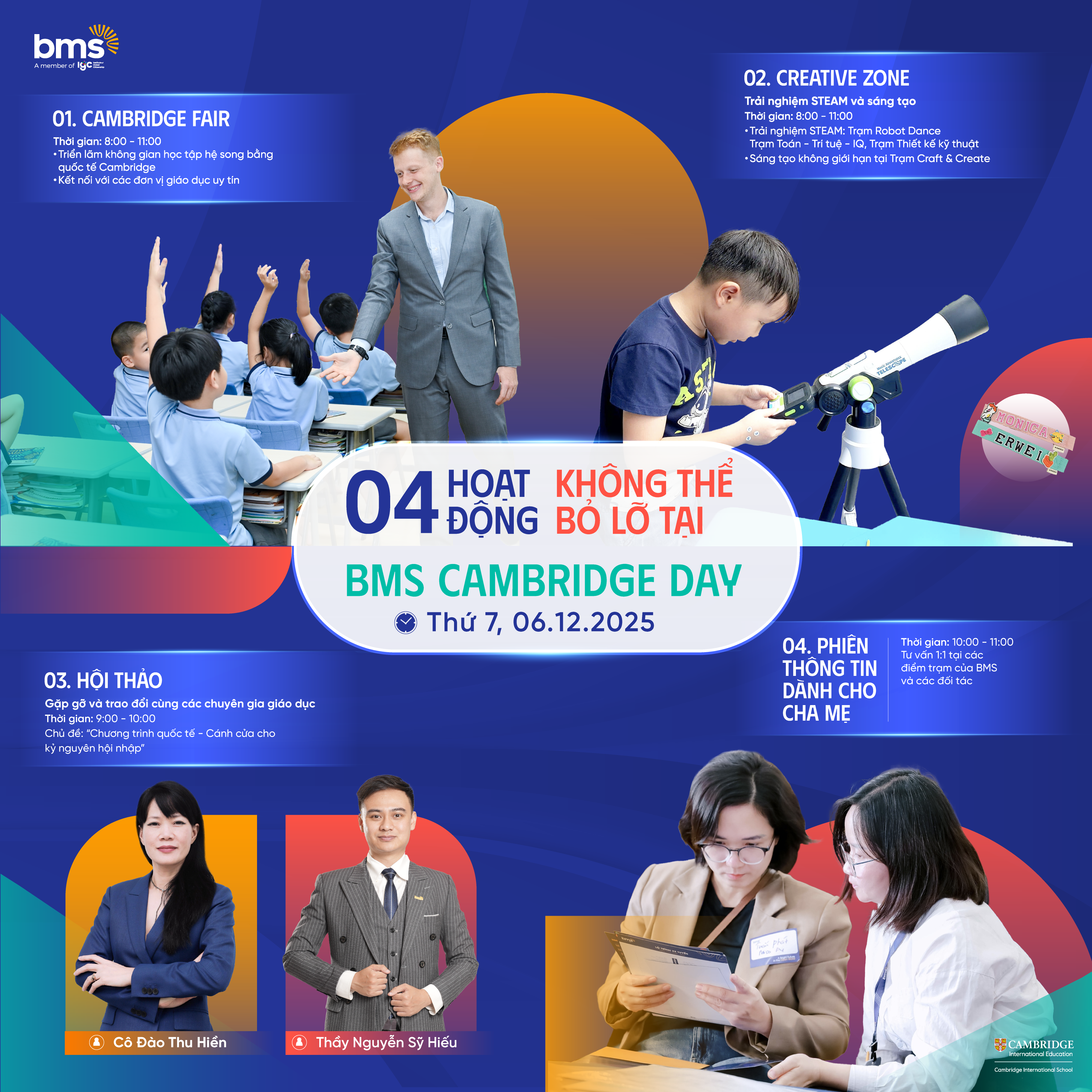 BMS Cambridge Day là sự kiện dành cho cha mẹ, học sinh từ 4 đến 14 tuổi, mở ra cơ hội trải nghiệm, khám phá và định hướng lộ trình học tập quốc tế. Tại đây, học sinh tham gia các hoạt động học tập sáng tạo, dự án trải nghiệm, kết nối trực tiếp với đội ngũ giáo viên, chuyên gia học thuật và các đối tác giáo dục uy tín toàn cầu.