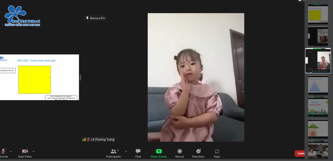 Trước những biến đổi của xã hội, với phương châm “dừng đến trường nhưng không dừng học” Ban Mai luôn có phương án tối ưu để việc học tập của trẻ không bị gián đoạn. Trẻ được tham gia tương tác trực tuyến, thực hiện các nhiệm vụ tại nhà dưới sự hướng dẫn của cô giáo và sự đồng hành hỗ trợ của cha mẹ.