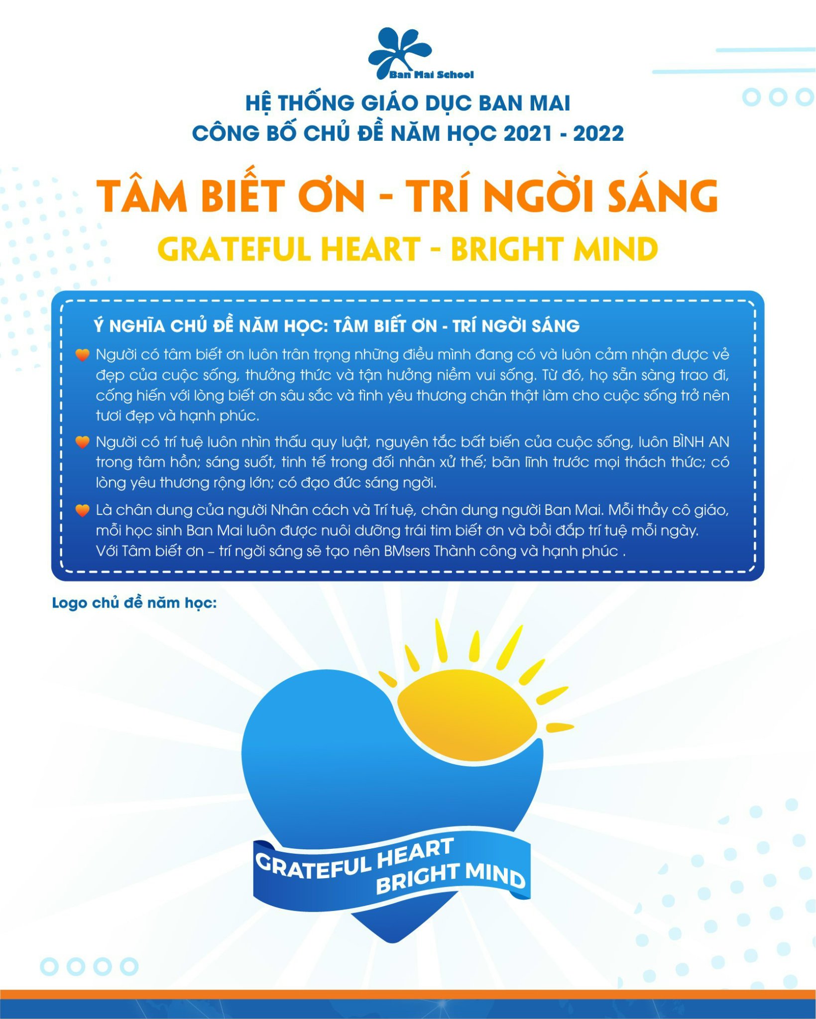 Sau hành trình “Cống hiến và lan tỏa” của năm học 2020 – 2021, năm học mới 2021 – 2022 đã chính thức được gọi tên với chủ đề: “Tâm biết ơn – trí ngời sáng” (Grateful Heart Bright Mind).