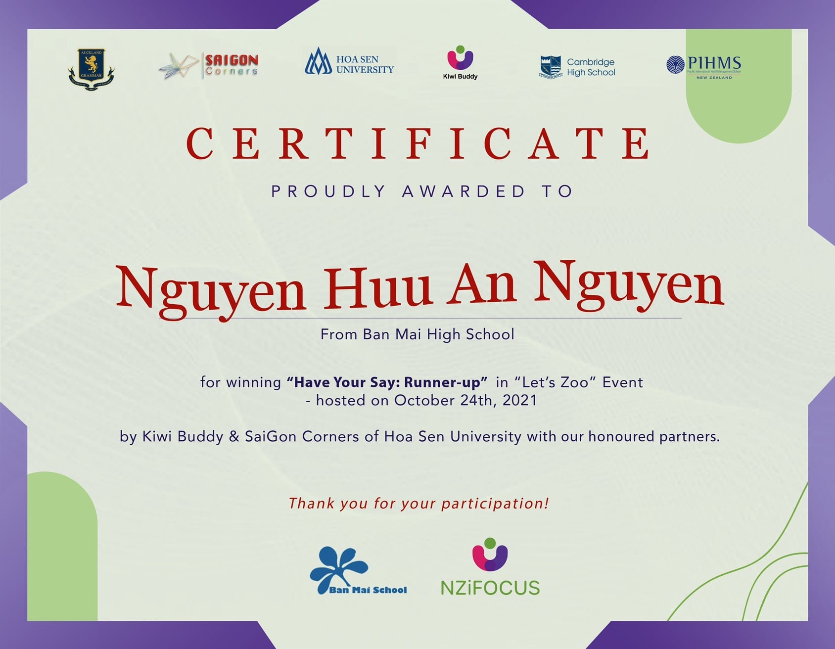 Đánh giá của KIWI BUDDY “Chúc mừng Nguyễn Hữu An Nguyên trường #Ban_Mai_School đã dành giải 2 cuộc thi “Have Your Say” trong buổi giao lưu quốc tế giữa Việt Nam – New Zealand do #SaigGon_Corners của Đại học Hoa Sen và #Kiwi_Buddy đồng tổ chức! Tuy con mới lớp 7 thôi nhưng tiếng anh và hùng biện rất đáng nể phục. Con hãy lan toả sự tự tin và tạo động lực cho nhiều bạn tham gia trong những sự kiện tới!