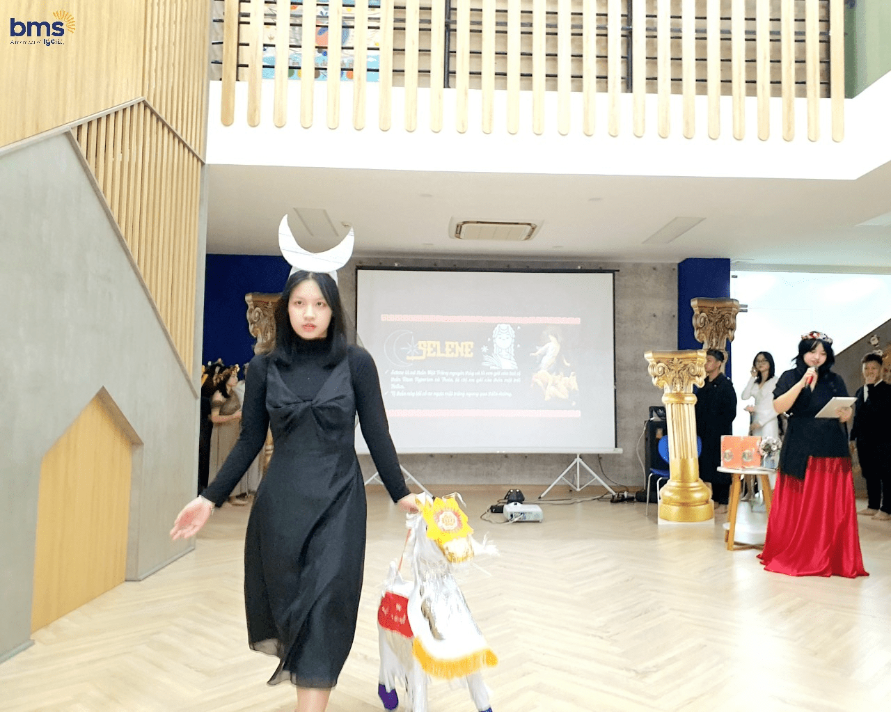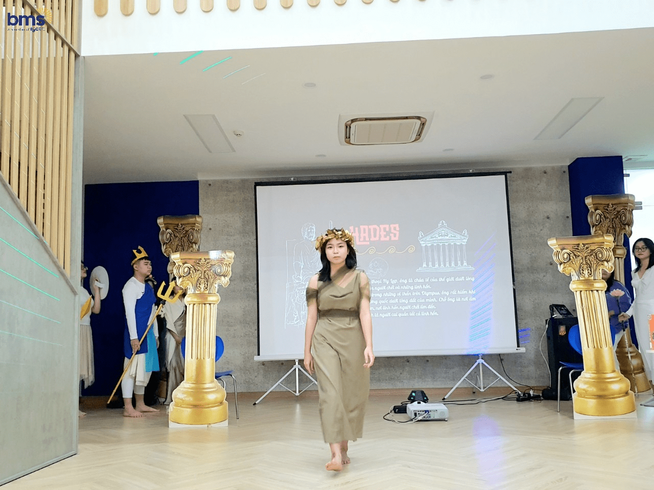 Không chỉ có sự chuẩn bị kỹ lưỡng về trang phục mà các bạn học sinh lớp 12S còn mô phỏng chi tiết về tính cách của các vị thần thông qua hành động, biểu cảm khuôn mặt và cách trình diễn trên sân khấu. Các bạn thực sự đã hóa thân trọn vẹn để trở thành những vị thần đầy quyền năng trong thần thoại Hy Lạp.