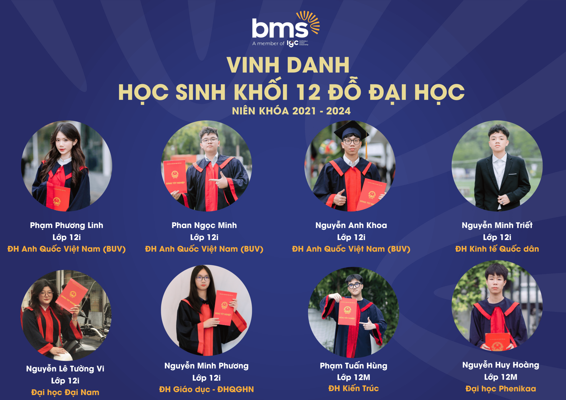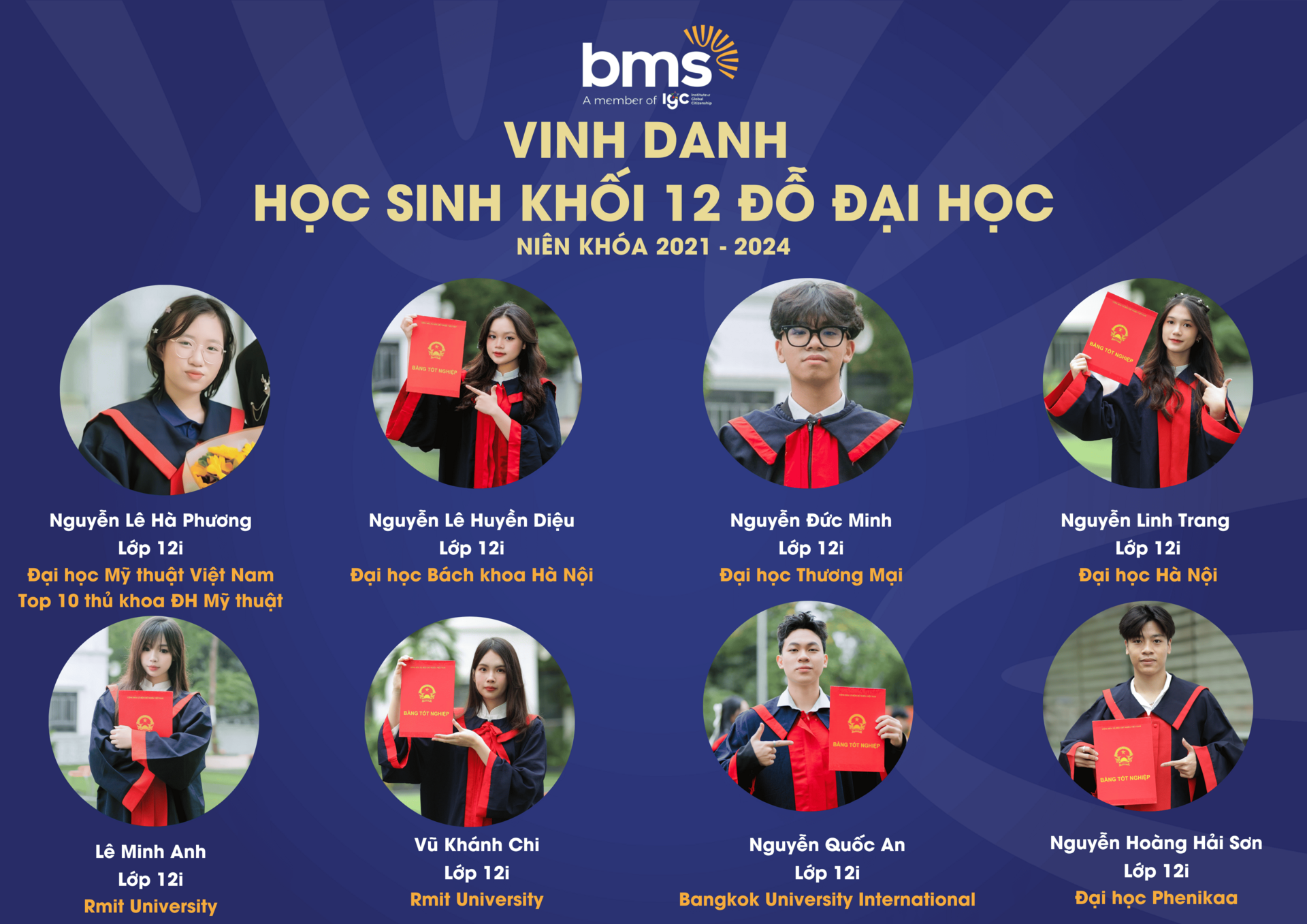 Thầy cô tự hào vinh danh thành tích xuất sắc của 100% học sinh Khối 12 (niên khóa 2021 – 2024) đã gặt hái những trái ngọt mang tên “Đỗ Đại học” trên hành trình giáo dục đầy khát vọng và kiên định của BMS.Với sự đồng hành tận tâm từ đội ngũ giáo viên, cùng phương pháp giảng dạy hiện đại, kết hợp giữa kiến thức và kỹ năng thực tiễn, BMS đã tạo nên một môi trường học tập - nơi mỗi học sinh được khơi dậy đam mê và định hướng tương lai. Thành tích 100% học sinh đỗ tốt nghiệp THPT và chinh phục bảng vàng Đại học là minh chứng cho chất lượng giáo dục vượt trội mà BMS mang đến cho mỗi thế hệ học sinh.