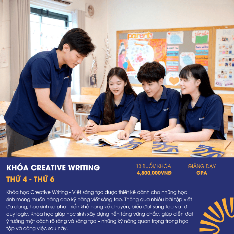 • Khóa Creative Writing: Khóa học phát triển khả năng viết sáng tạo, giúp học sinh biểu đạt tư duy và cảm xúc một cách mạch lạc và sáng tạo – những kỹ năng quan trọng trong học tập và công việc sau này.