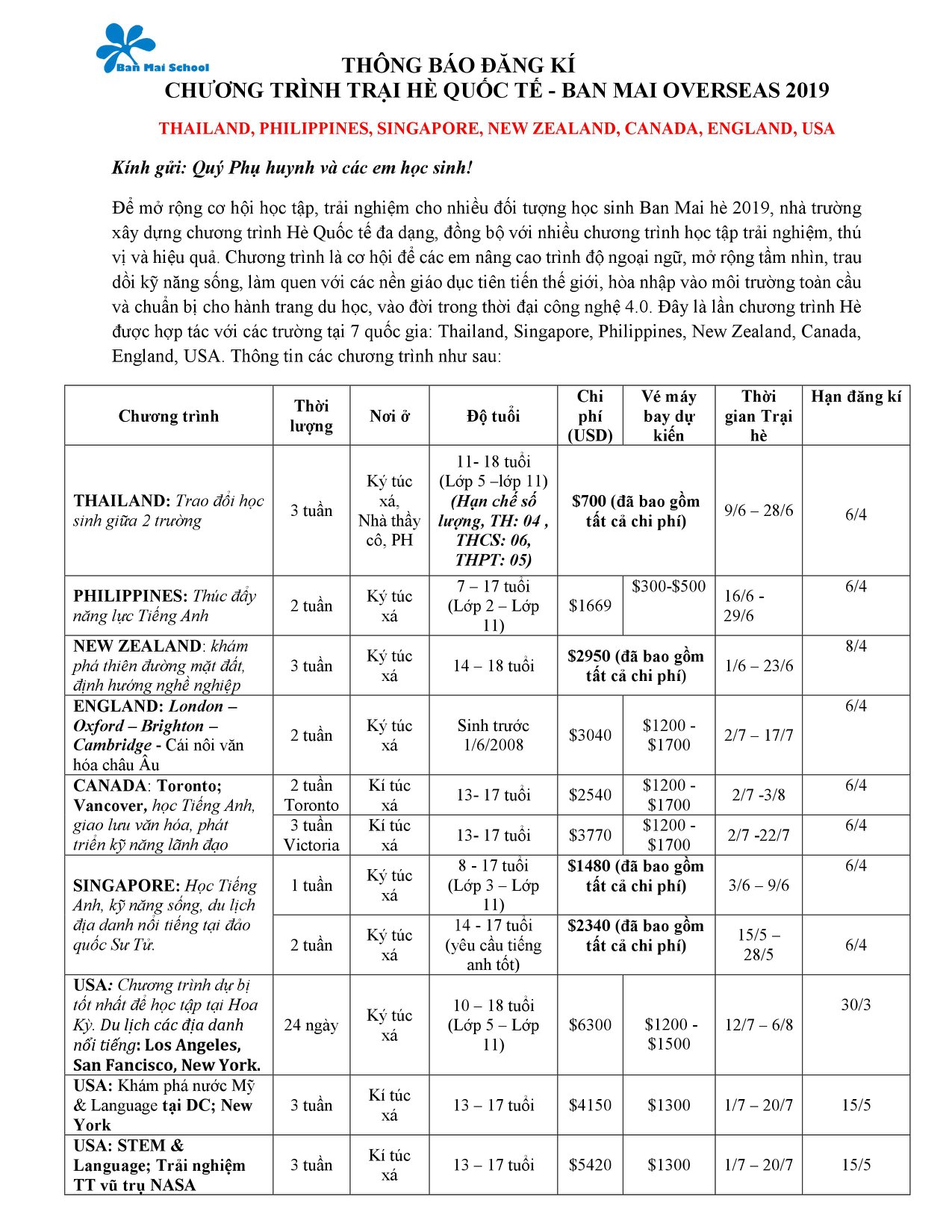 TỔNG QUAN CHƯƠNG TRÌNH TRẠI HÈ QUỐC TẾ – BAN MAI OVERSEAS 2019