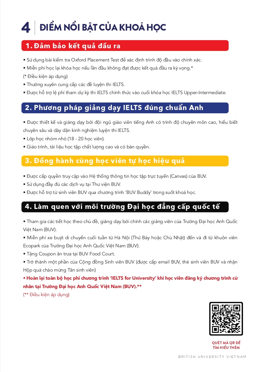 • Học Phí (không bao gồm các phí khác) của khóa IELTS sẽ được hoàn lại toàn bộ khi học sinh nhập học bất cứ chương trình cử nhân nào tại BUV với điều kiện ưu đãi học phí/học bổng của chương trình cử nhân không vượt quá 15% học phí. Học phí sẽ được trừ đều trong ba năm đại học.