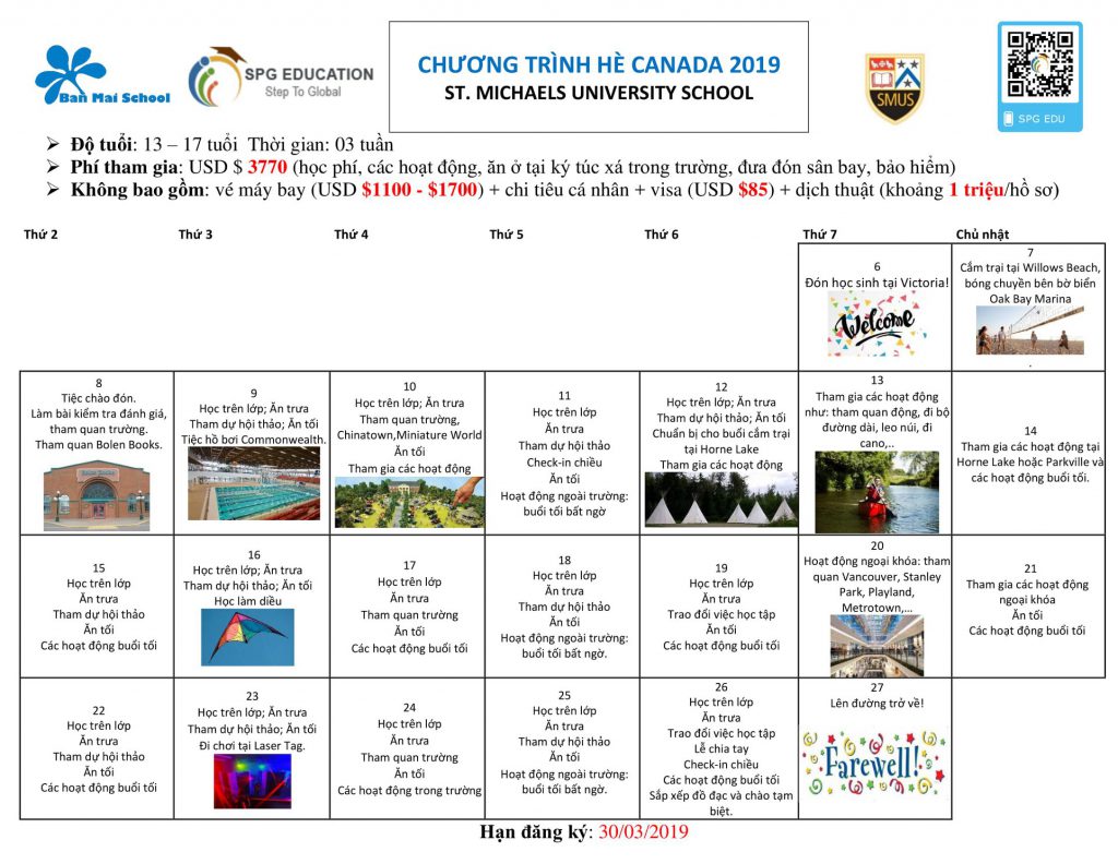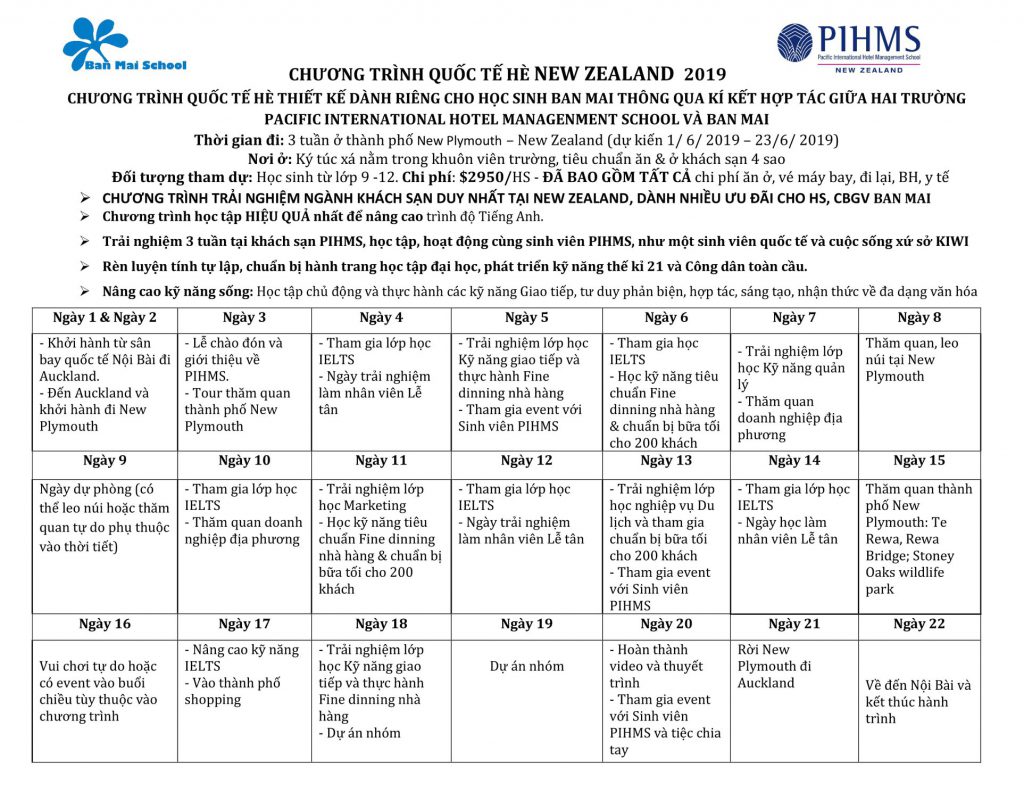 Đây là lần chương trình Hè được hợp tác với các trường tại 7 quốc gia: Thailand, Singapore, Philippines, New Zealand, Canada, England, USA. Thông tin các chương trình như sau: