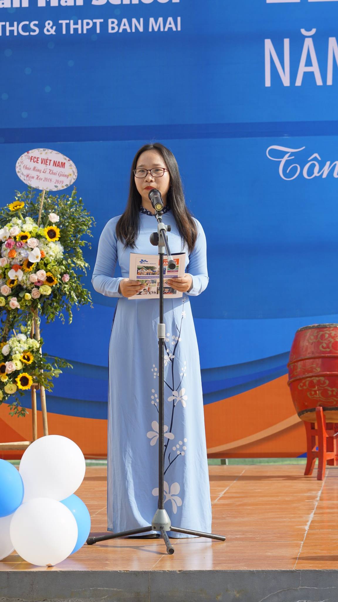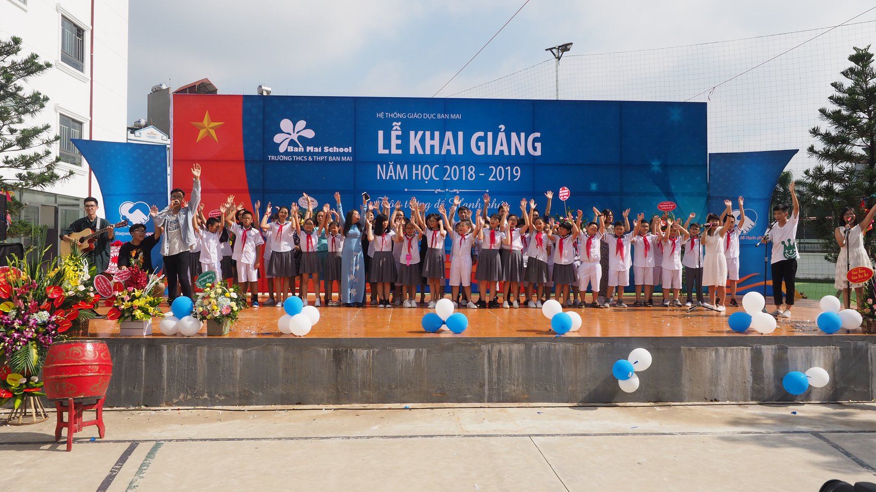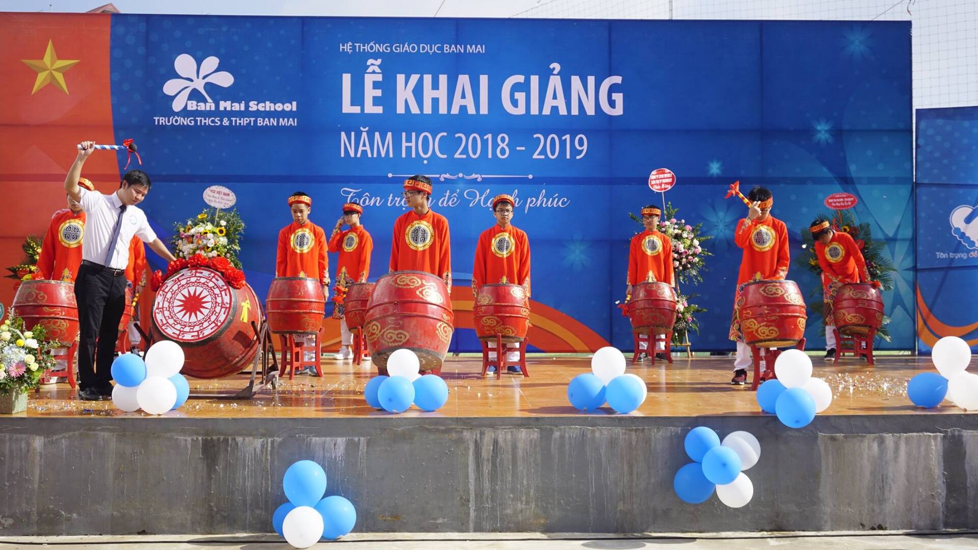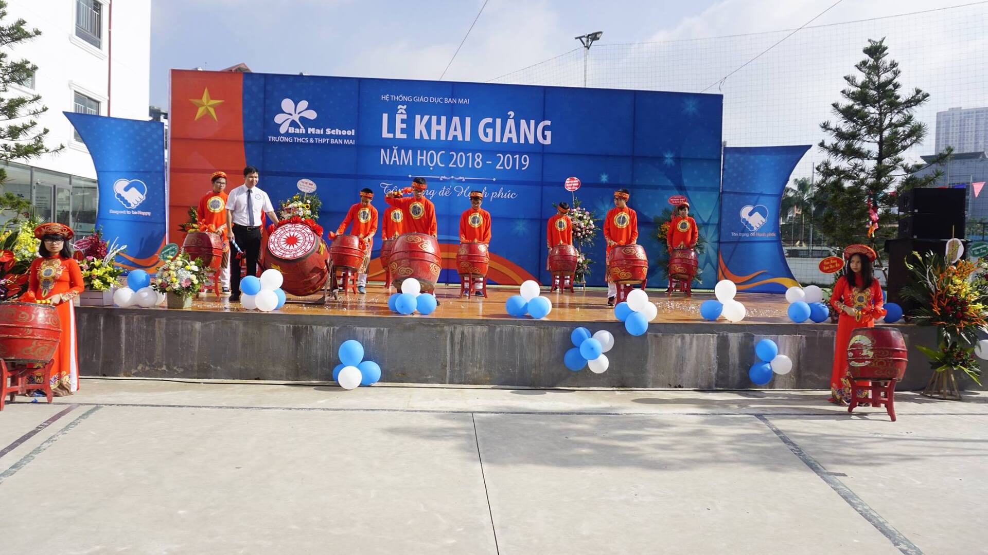 Thầy Nguyễn Khánh Chung – Hiệu trưởng Trường THCS&THPT Ban Mai đánh trống khai trường – tuyên bố Khai giảng năm học mới 2018 – 2019 với chủ đề: “Tôn trọng để Hạnh Phúc”