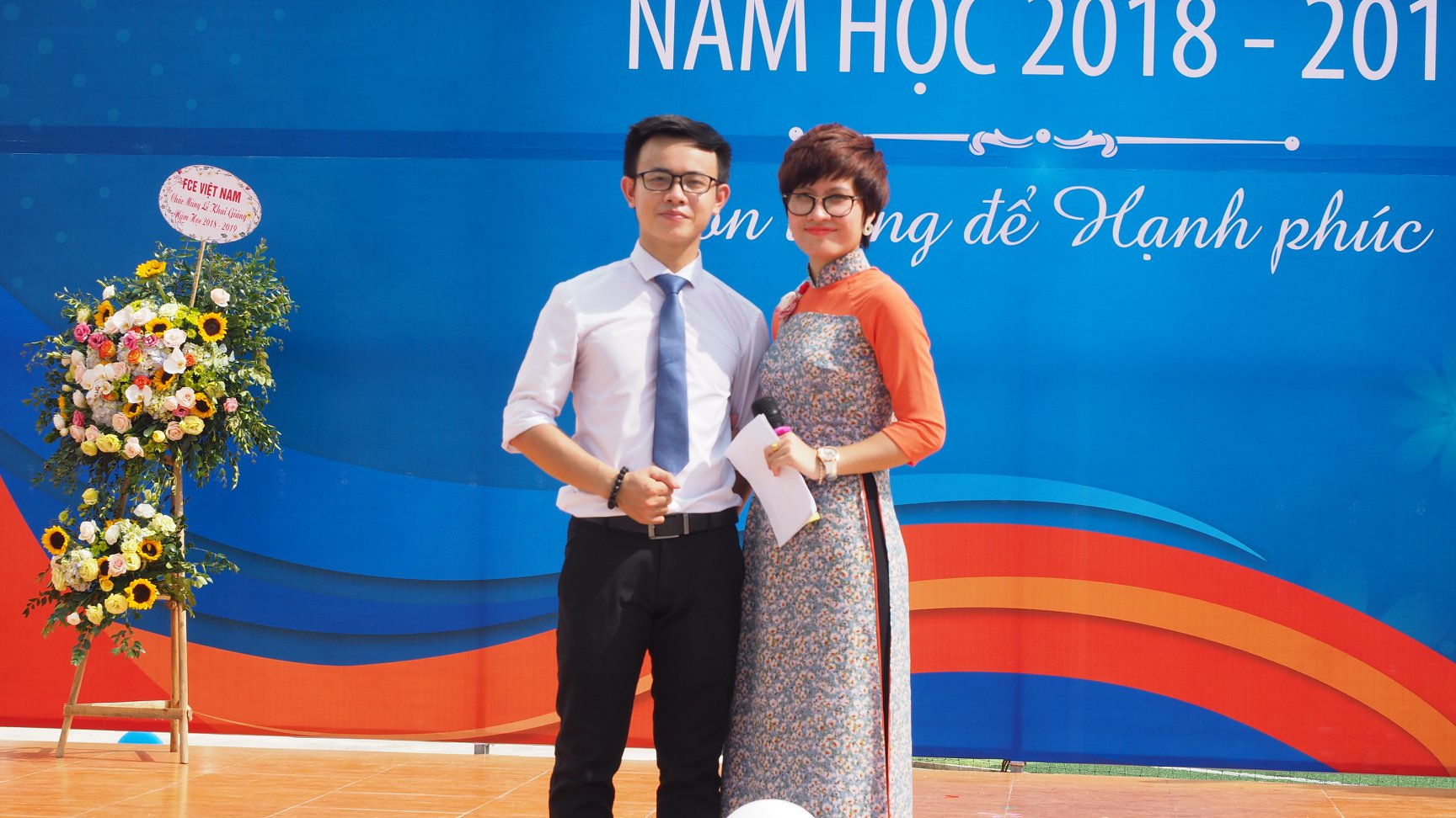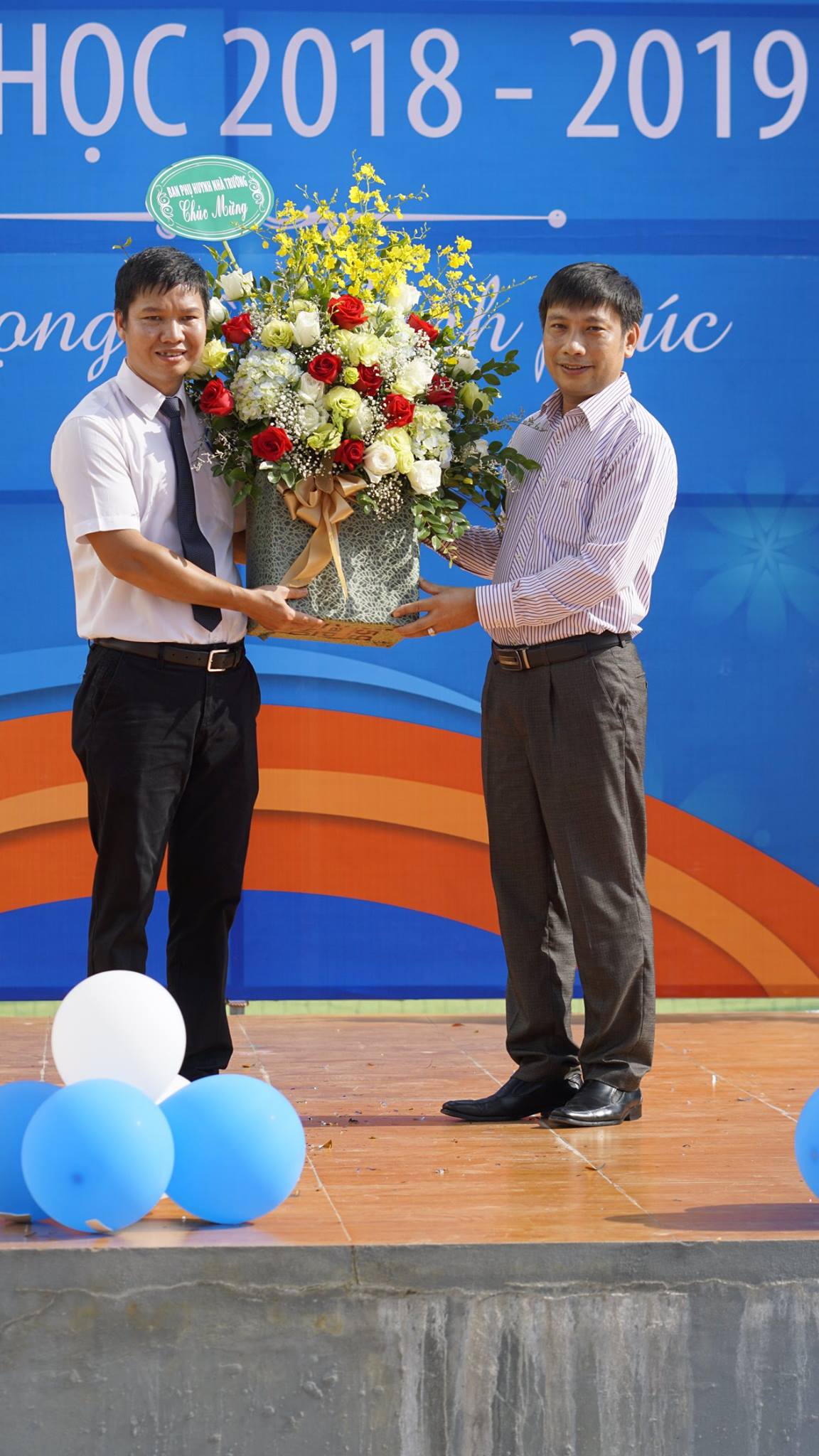 Ông Lê Anh Tuấn – Chủ tịch Hội đồng Cha Mẹ học sinh trường THCS&THPT Ban Mai trao lẵng hoa tươi thắm chúc mừng Nhà trường nhân địp năm học mới.