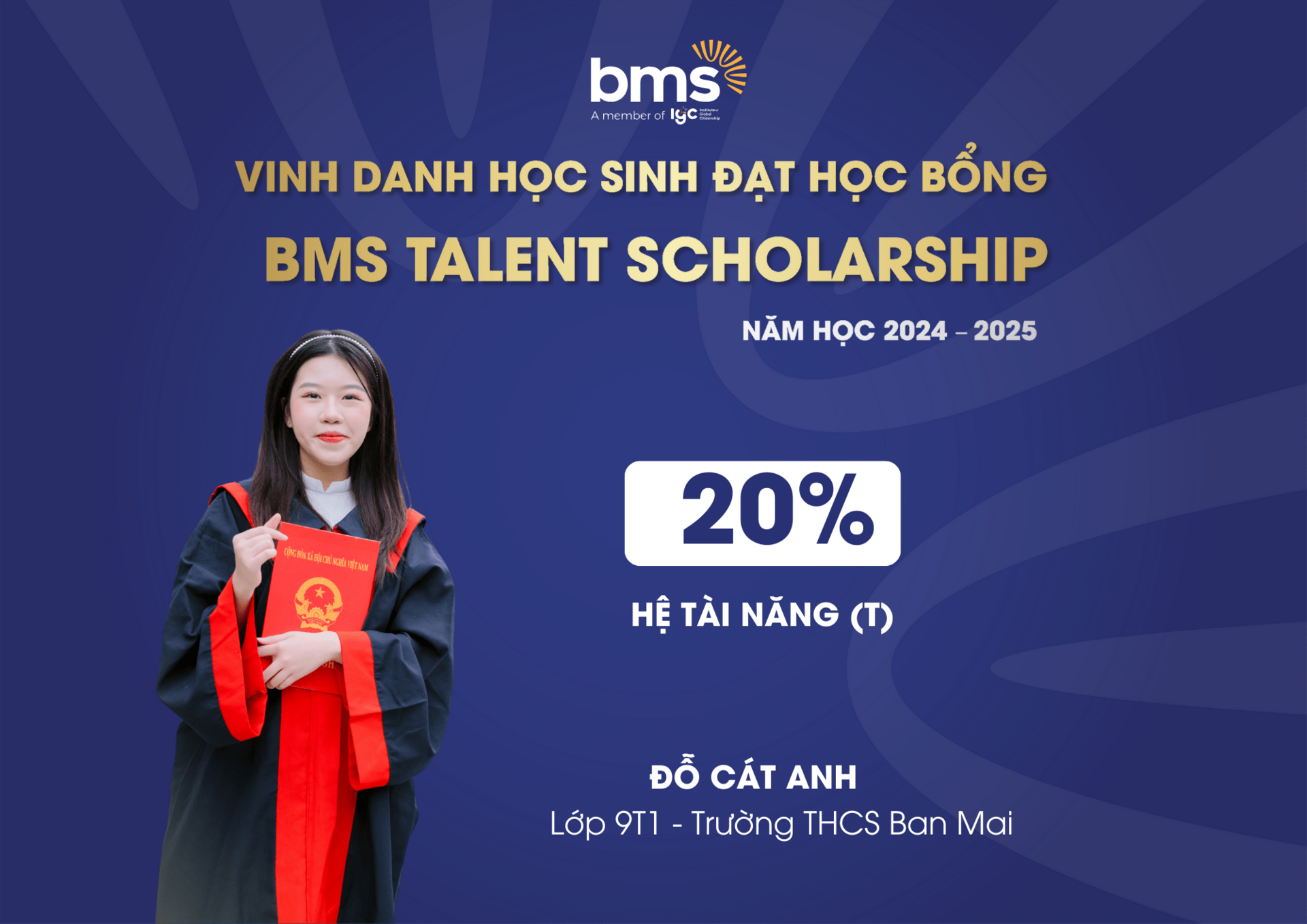 Đây là học bổng danh giá, tôn vinh những học sinh đạt thành tích cao ở các cuộc thi về học thuật, năng khiếu, đồng thời tạo cơ hội cho các bạn được học tập, phát triển khả năng vượt trội của mình trong môi trường giáo dục tại BMS.