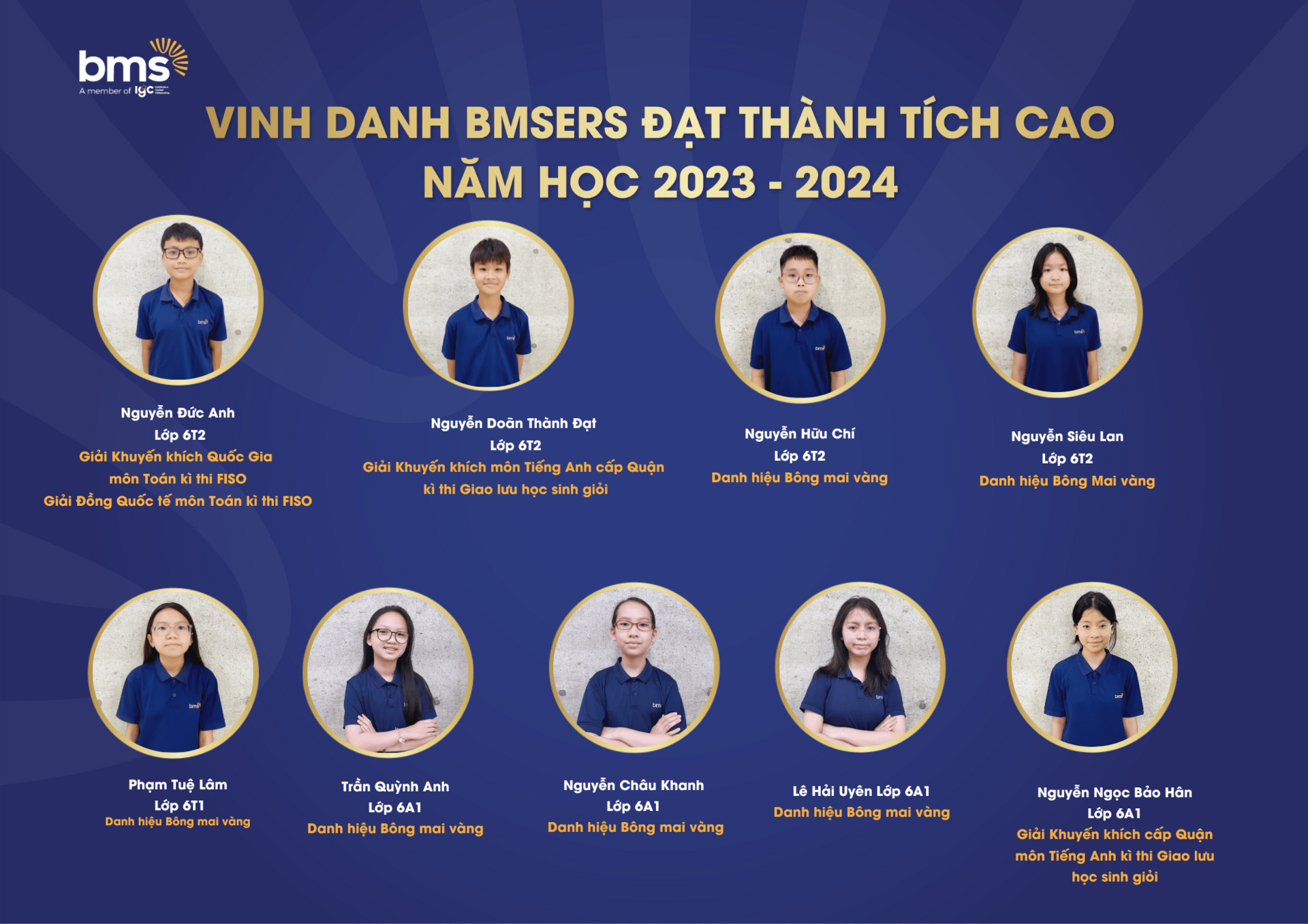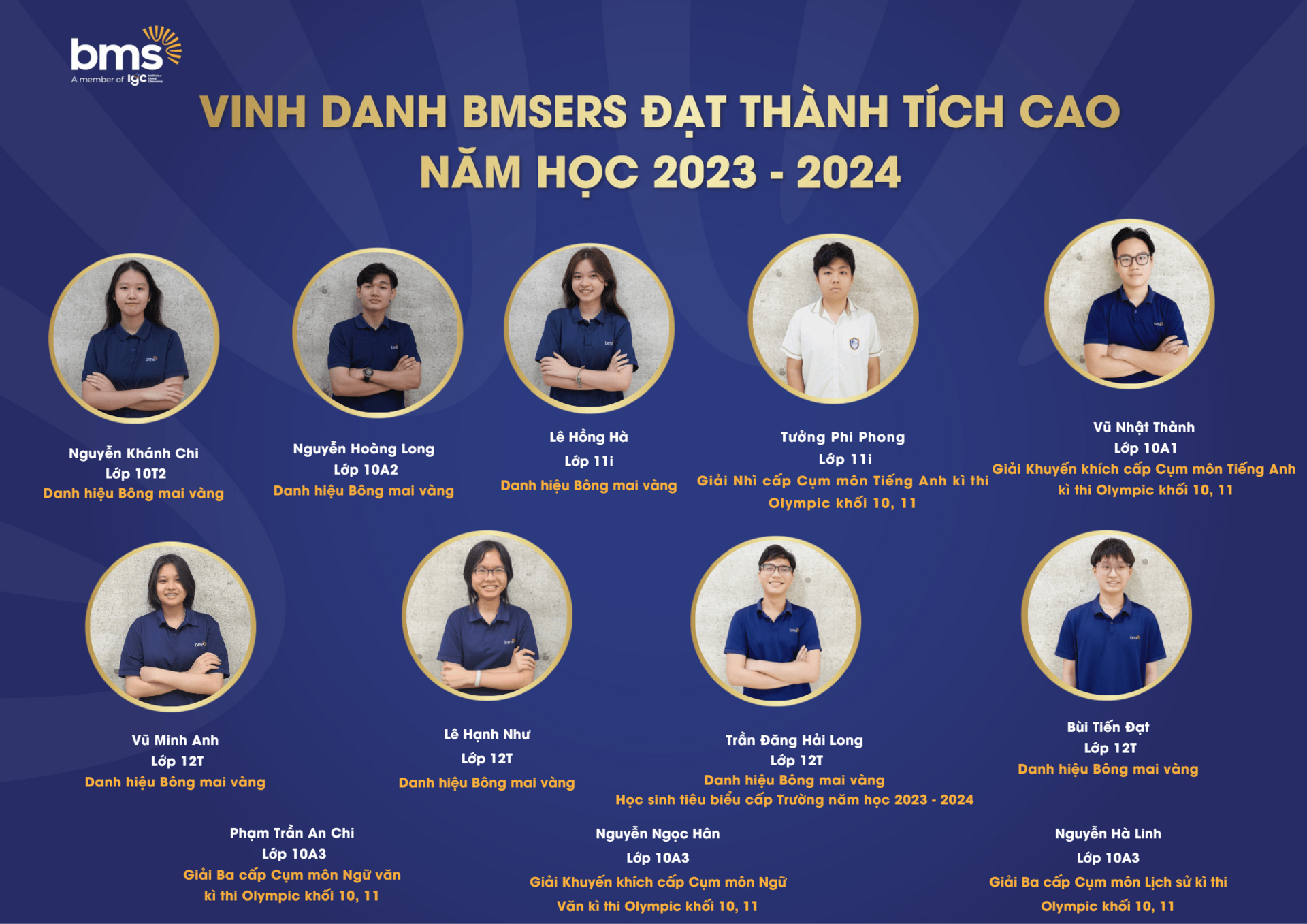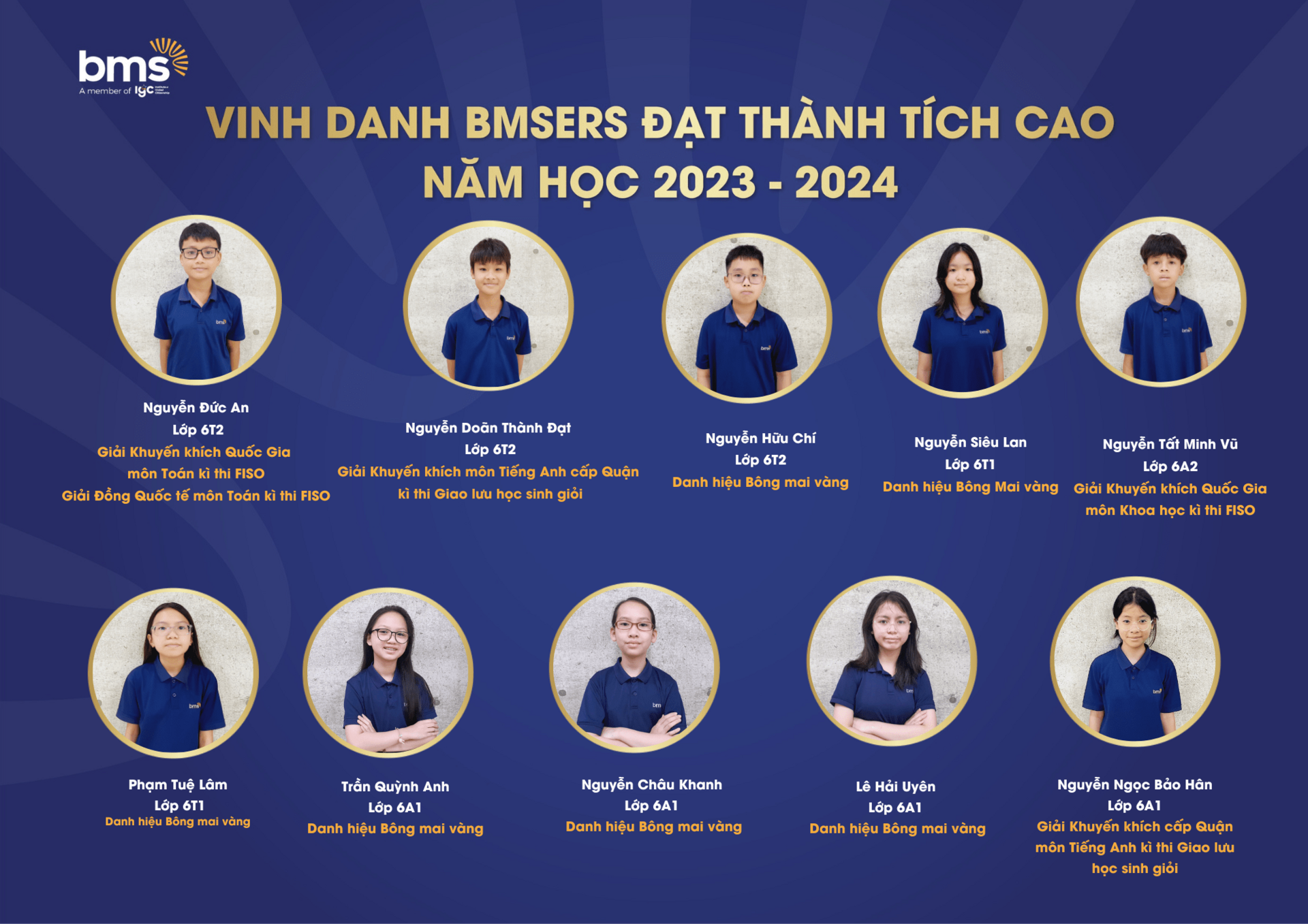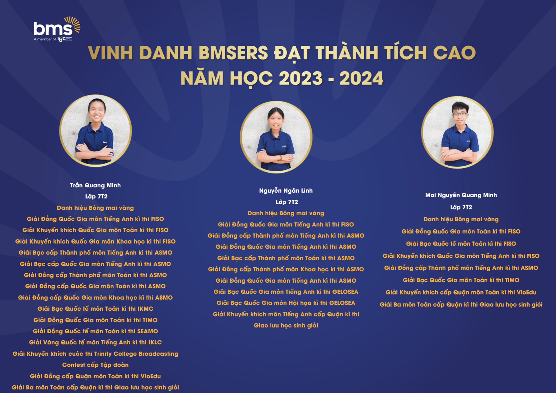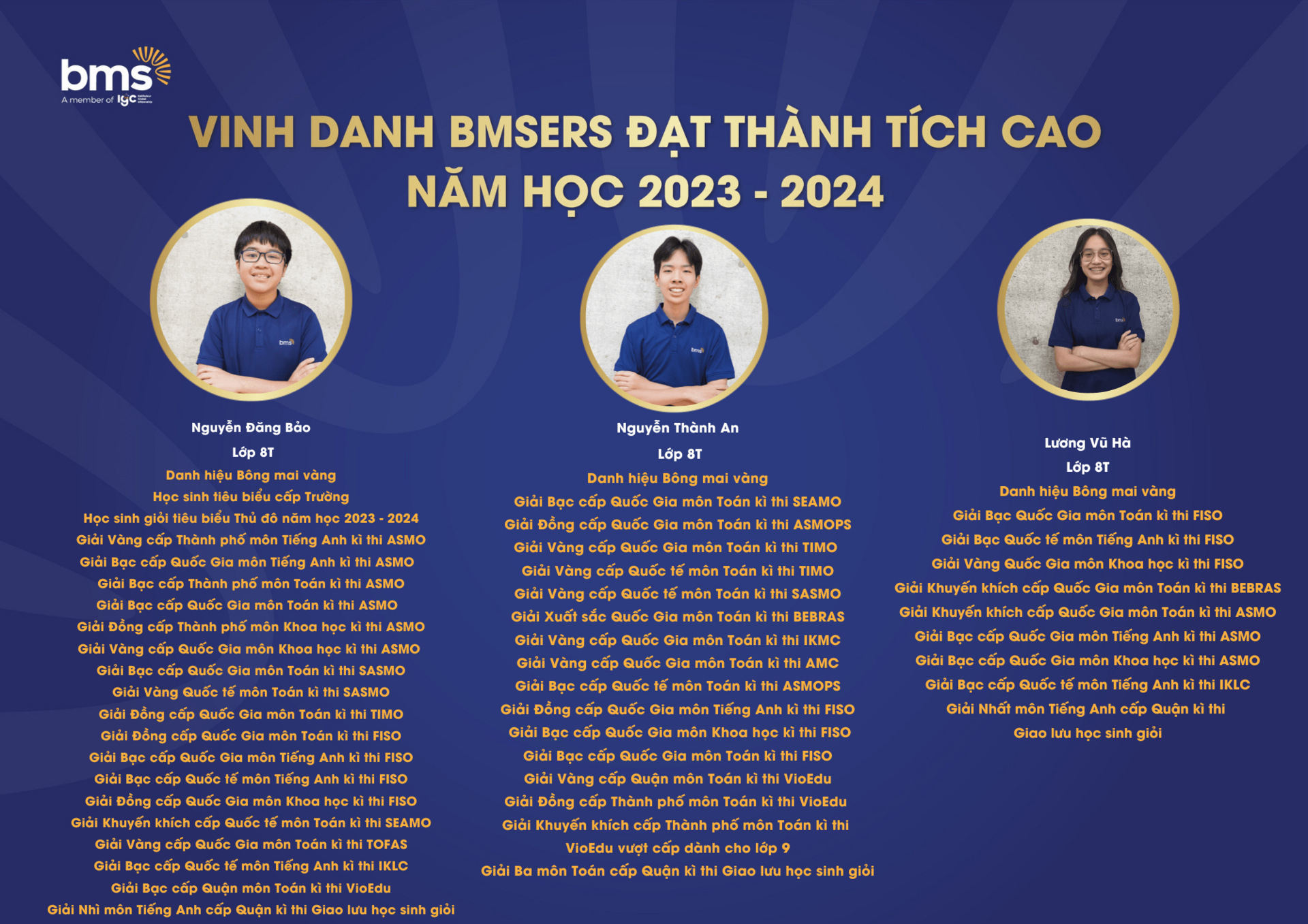 Trân trọng vinh danh các học sinh xuất sắc đã dành được nhiều thành tích cao trong năm học 2023 –2024. Chúc các bạn sẽ luôn vững vàng hành trang, tràn đầy tự tin, hứng khởi để cùng nhau tiếp tục viết nên câu chuyện thành công cho riêng mình và tiếp thêm động lực cho các BMSers kiên trì theo đuổi mục tiêu trên con đường học tập.