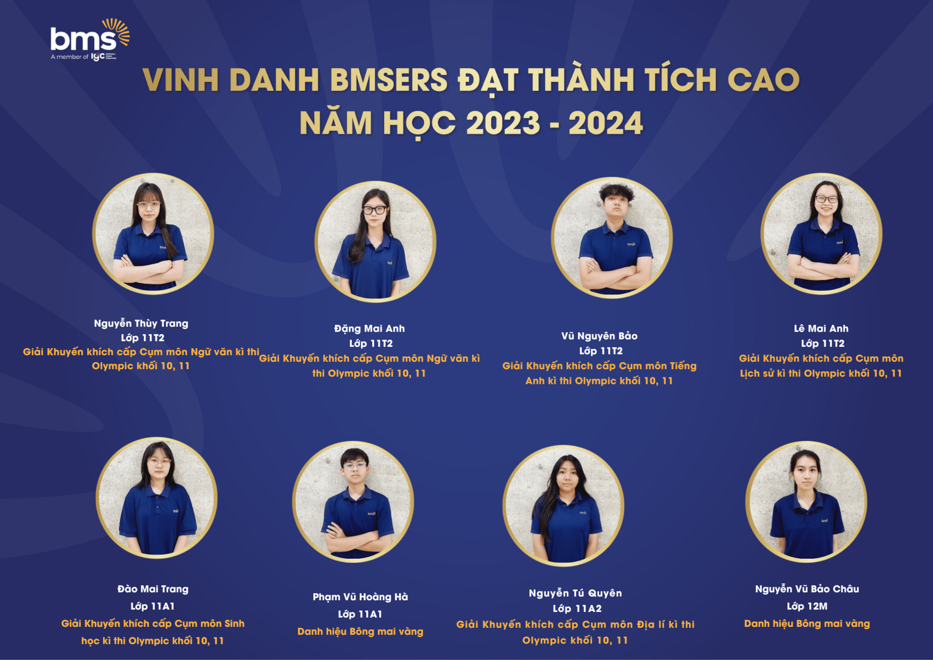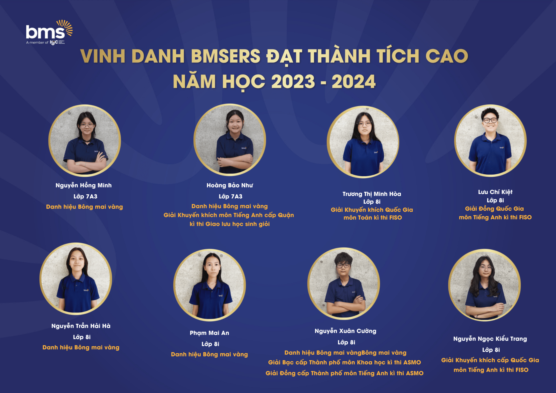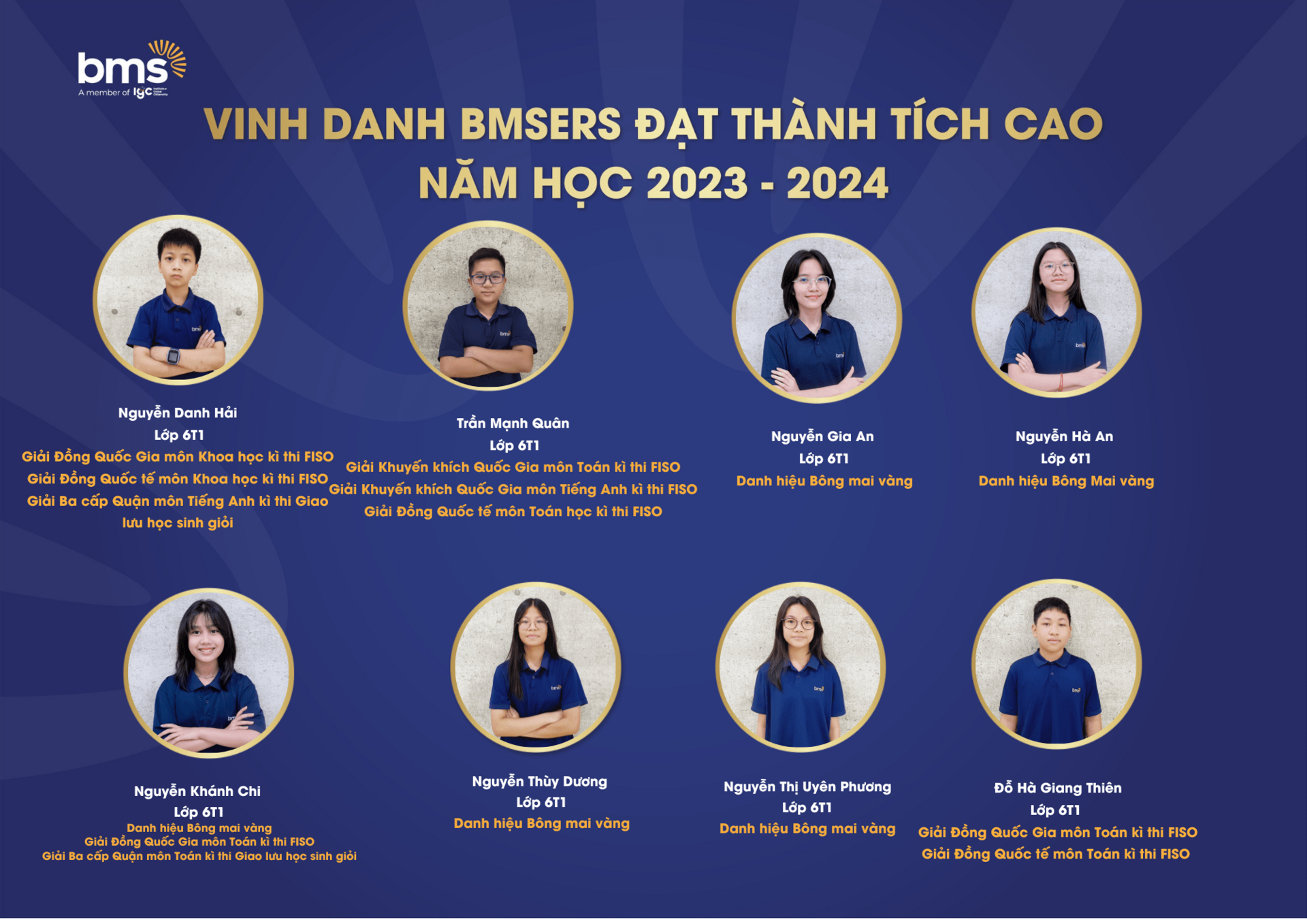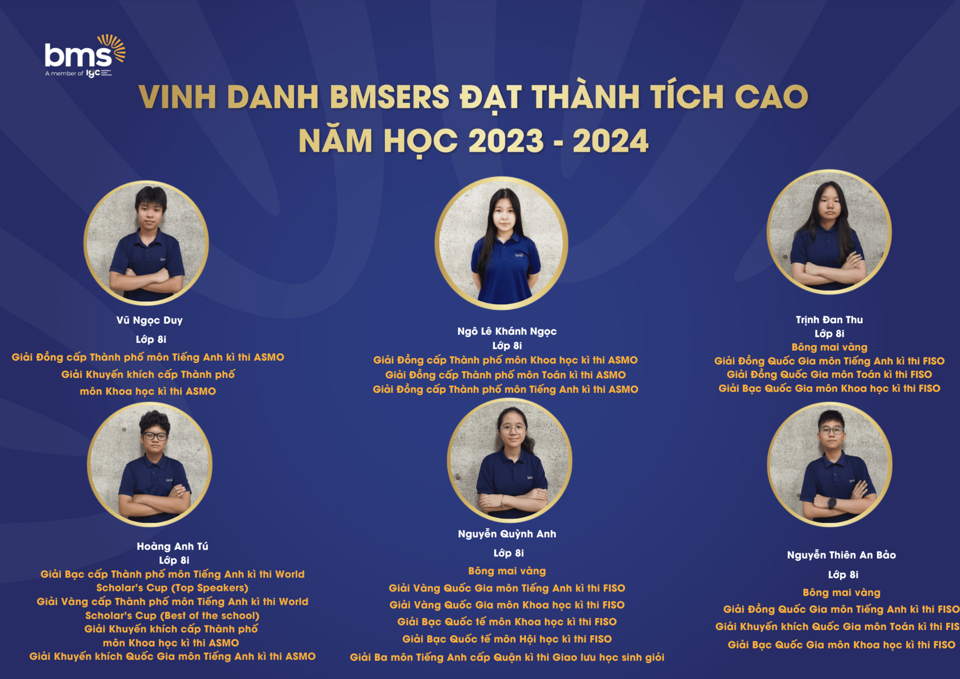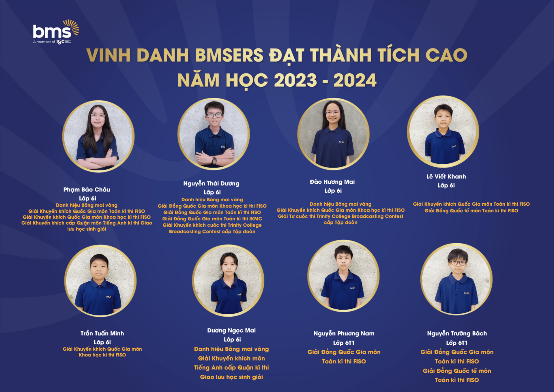 Trân trọng vinh danh các học sinh xuất sắc đã dành được nhiều thành tích cao trong năm học 2023 –2024. Chúc các bạn sẽ luôn vững vàng hành trang, tràn đầy tự tin, hứng khởi để cùng nhau tiếp tục viết nên câu chuyện thành công cho riêng mình và tiếp thêm động lực cho các BMSers kiên trì theo đuổi mục tiêu trên con đường học tập.