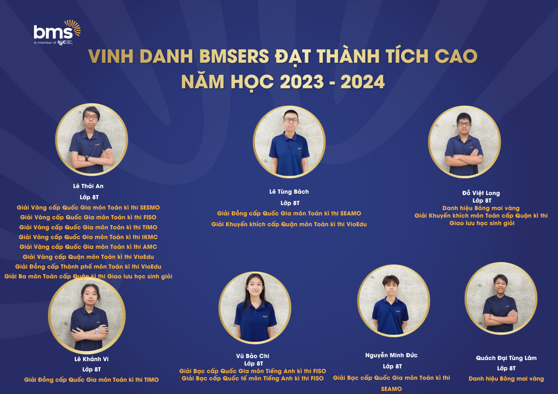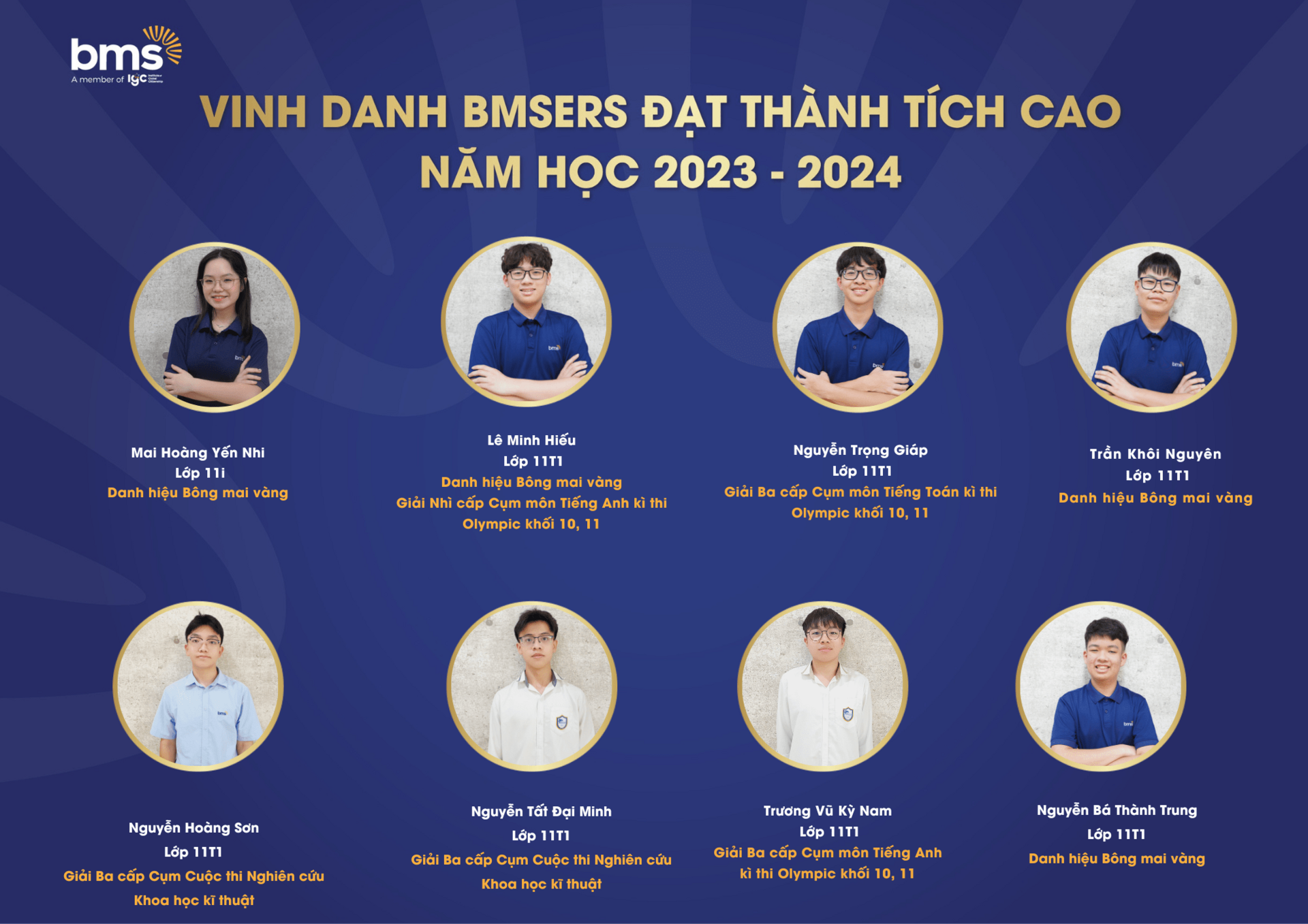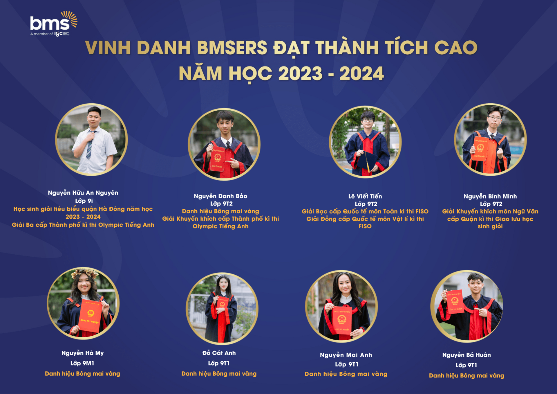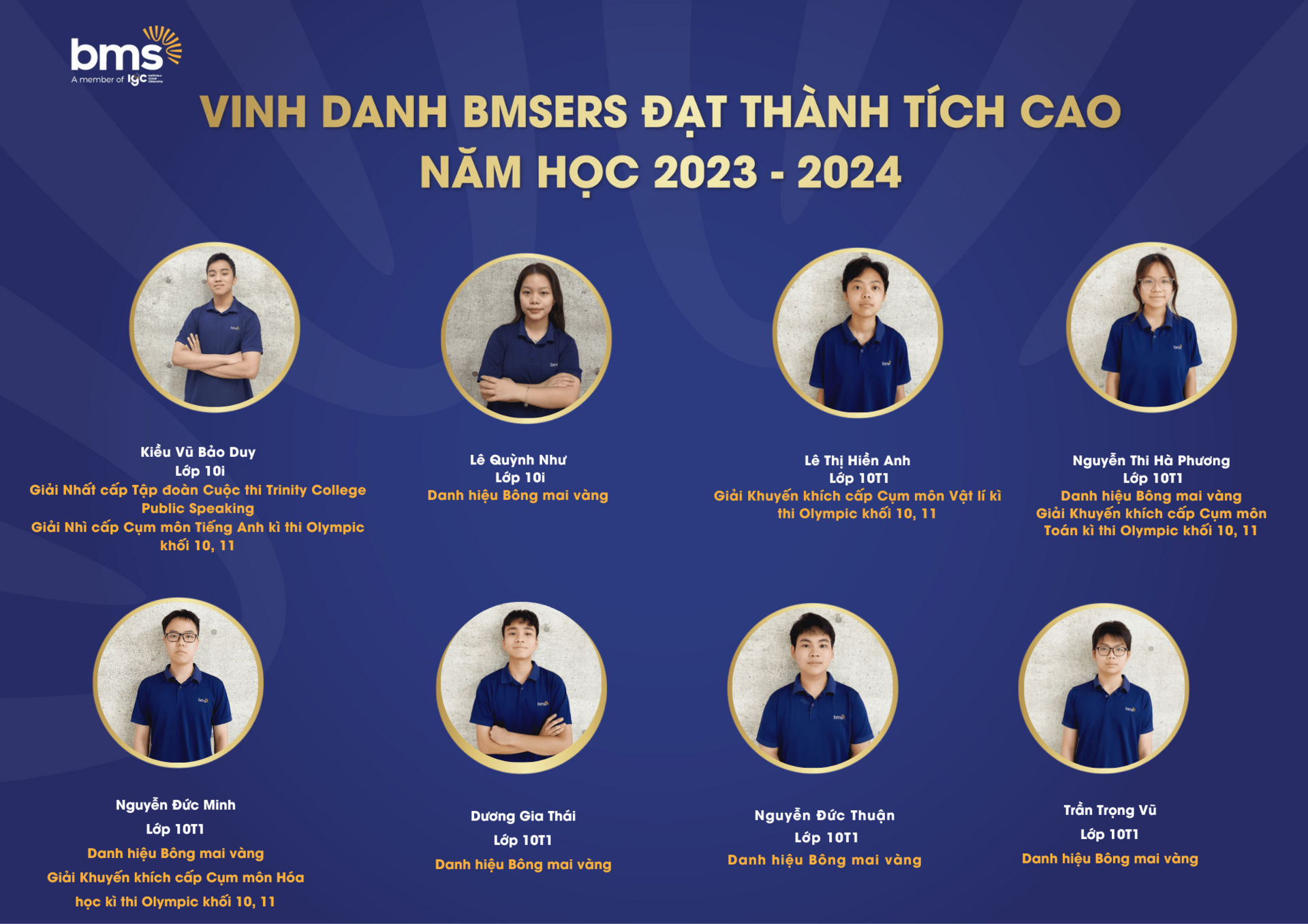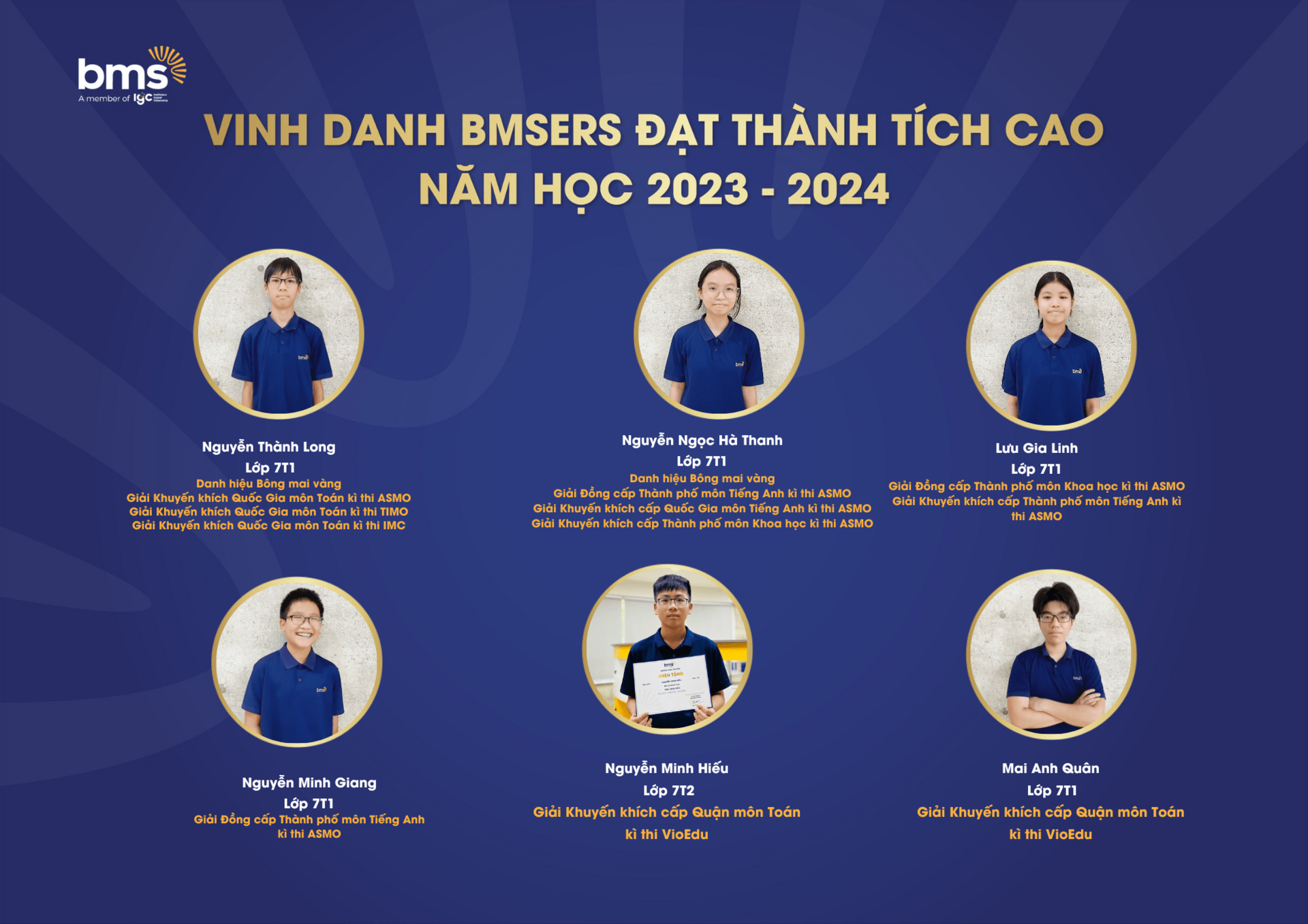 Trân trọng vinh danh các học sinh xuất sắc đã dành được nhiều thành tích cao trong năm học 2023 –2024. Chúc các bạn sẽ luôn vững vàng hành trang, tràn đầy tự tin, hứng khởi để cùng nhau tiếp tục viết nên câu chuyện thành công cho riêng mình và tiếp thêm động lực cho các BMSers kiên trì theo đuổi mục tiêu trên con đường học tập.