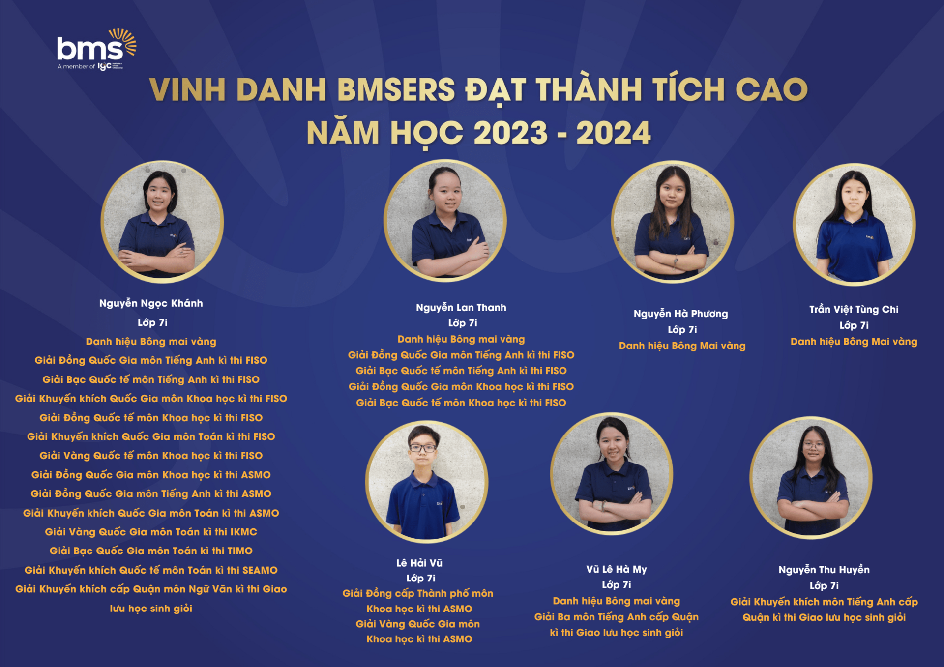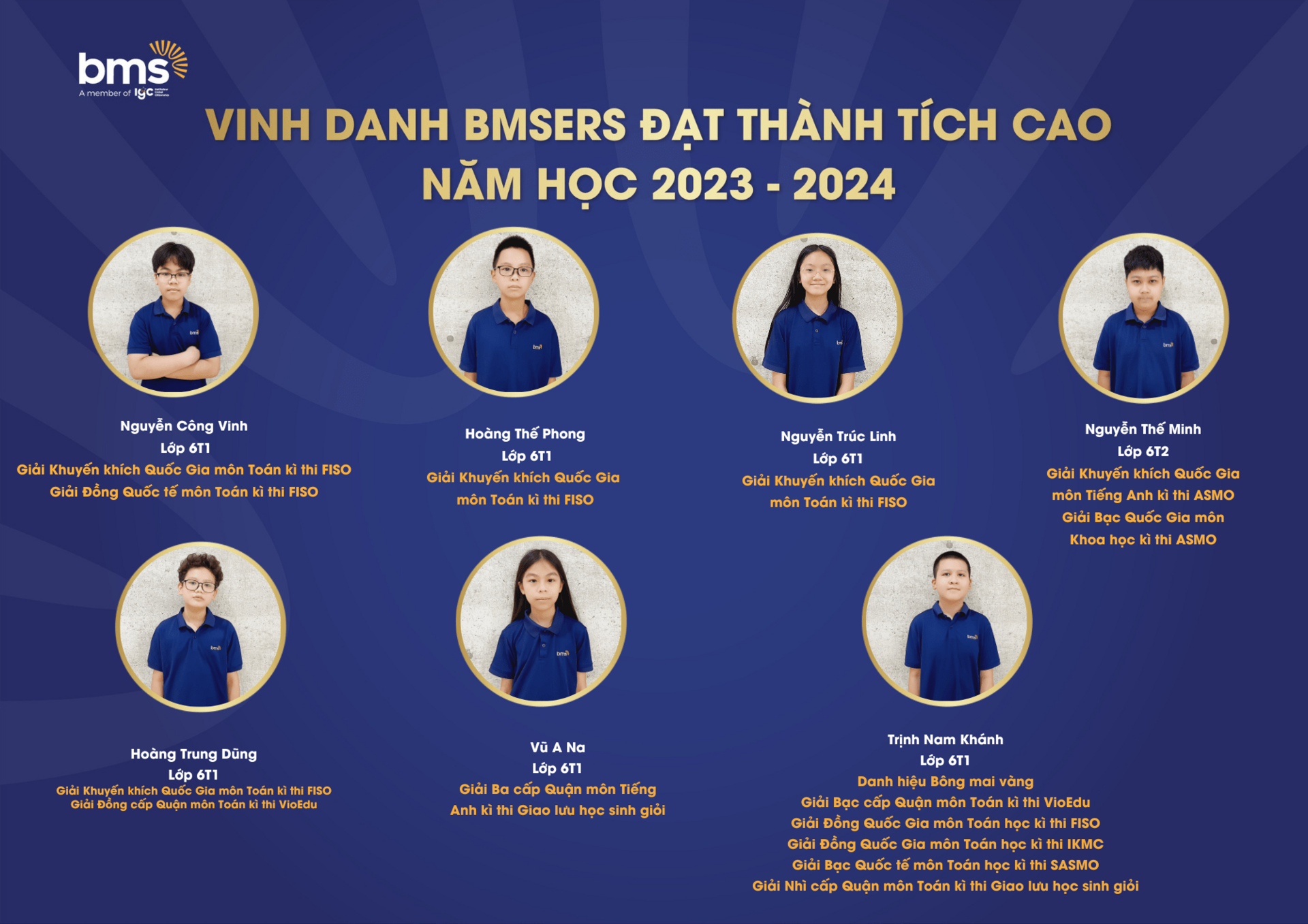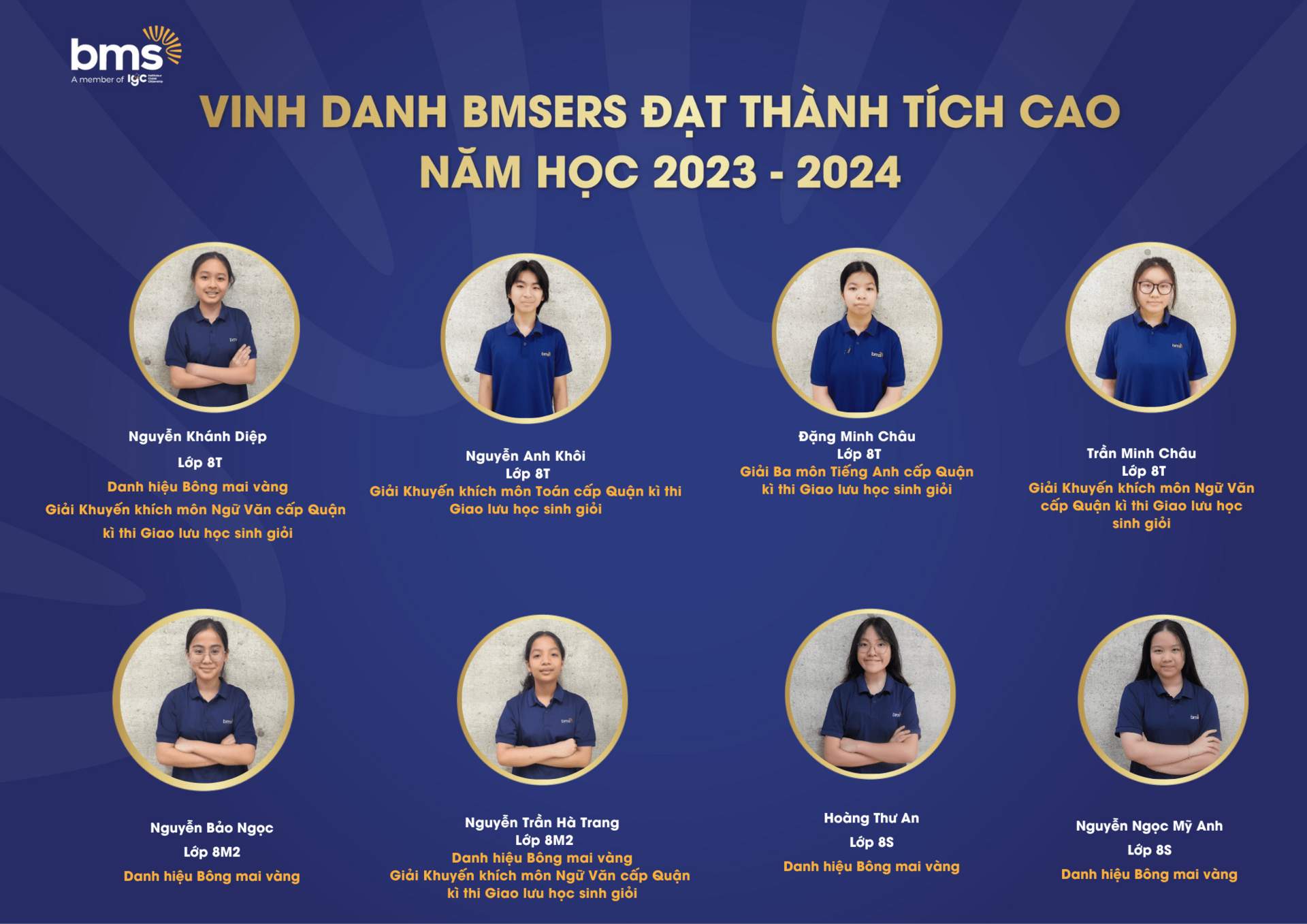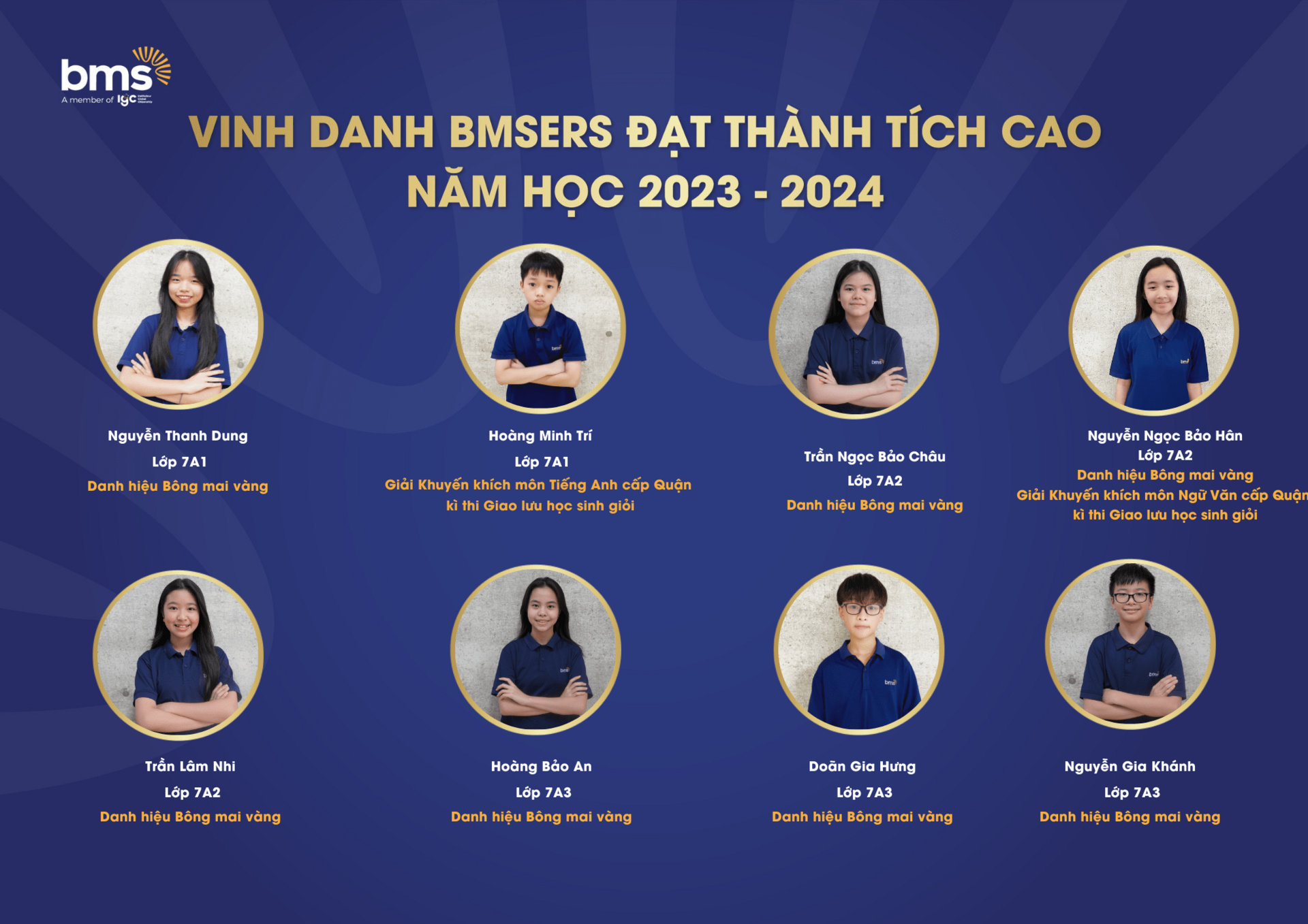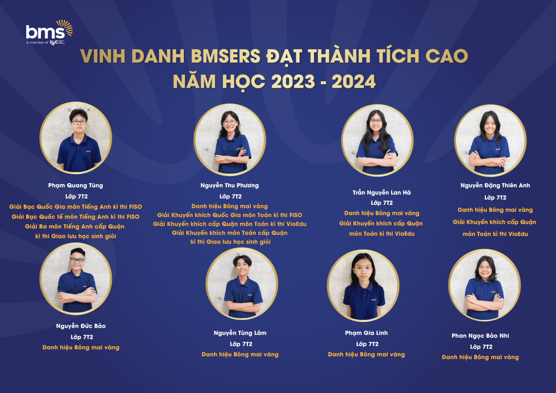 Trân trọng vinh danh các học sinh xuất sắc đã dành được nhiều thành tích cao trong năm học 2023 –2024. Chúc các bạn sẽ luôn vững vàng hành trang, tràn đầy tự tin, hứng khởi để cùng nhau tiếp tục viết nên câu chuyện thành công cho riêng mình và tiếp thêm động lực cho các BMSers kiên trì theo đuổi mục tiêu trên con đường học tập.