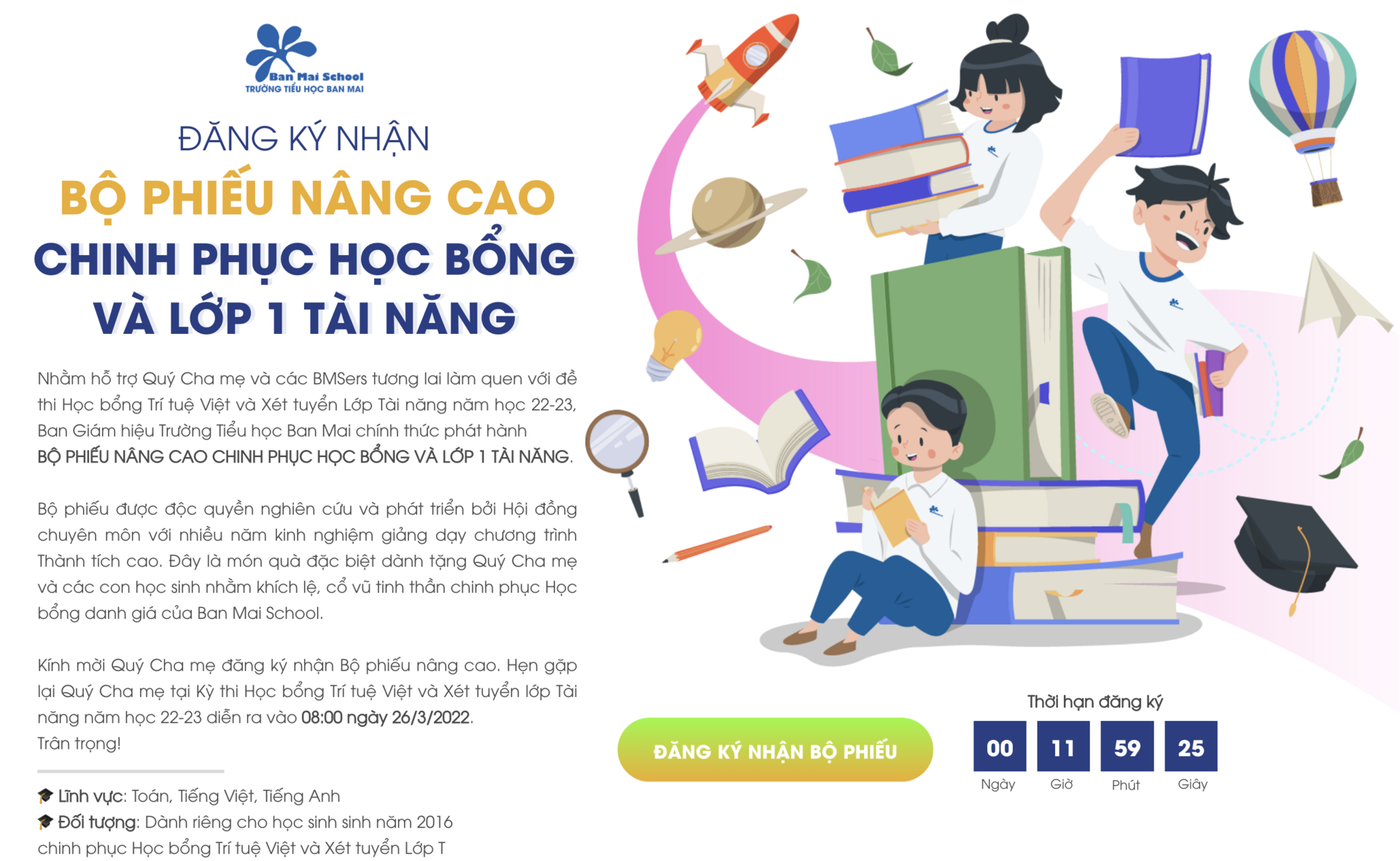 - Bước 2: CMHS đăng ký nhận Bộ phiếu nâng cao chinh phục Học bổng và Lớp 1 Tài năng tại: https://www.banmaischool.info/tainang