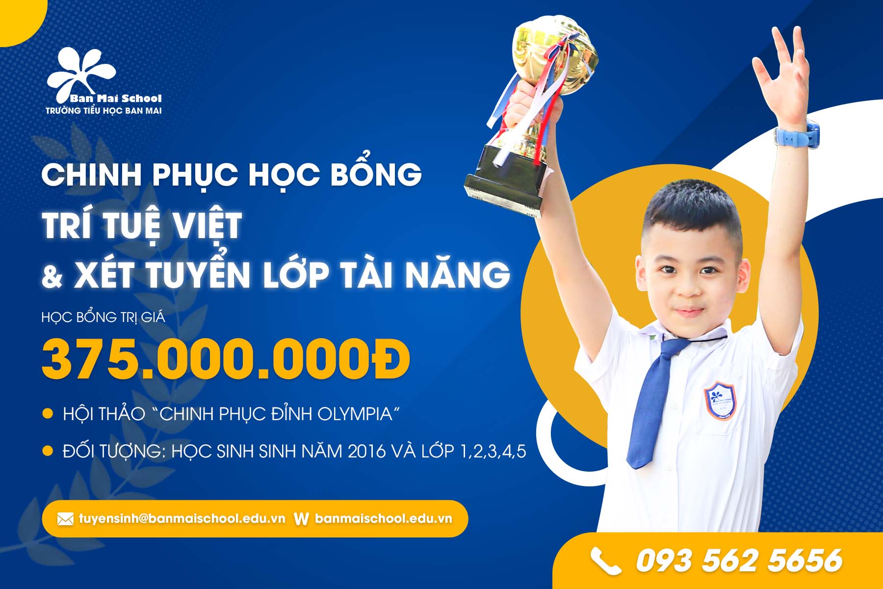 “Trí tuệ Việt” là học bổng thường niên của BMS với sứ mệnh tìm kiếm những học sinh có thành tích học tập xuất sắc để vinh danh, truyền động lực trở thành những BMSers tự tin chinh phục đỉnh cao, hội nhập toàn cầu. Kỳ thi Học bổng “Trí tuệ Việt” cũng là cơ hội cho các BMSers tương lai chinh phục các suất tuyển thẳng vào lớp Tài năng của Trường Tiểu học Ban Mai dành cho các học sinh đạt kết quả toàn diện và vượt trội ở 3 môn: Toán – Tiếng Việt – Tiếng Anh.