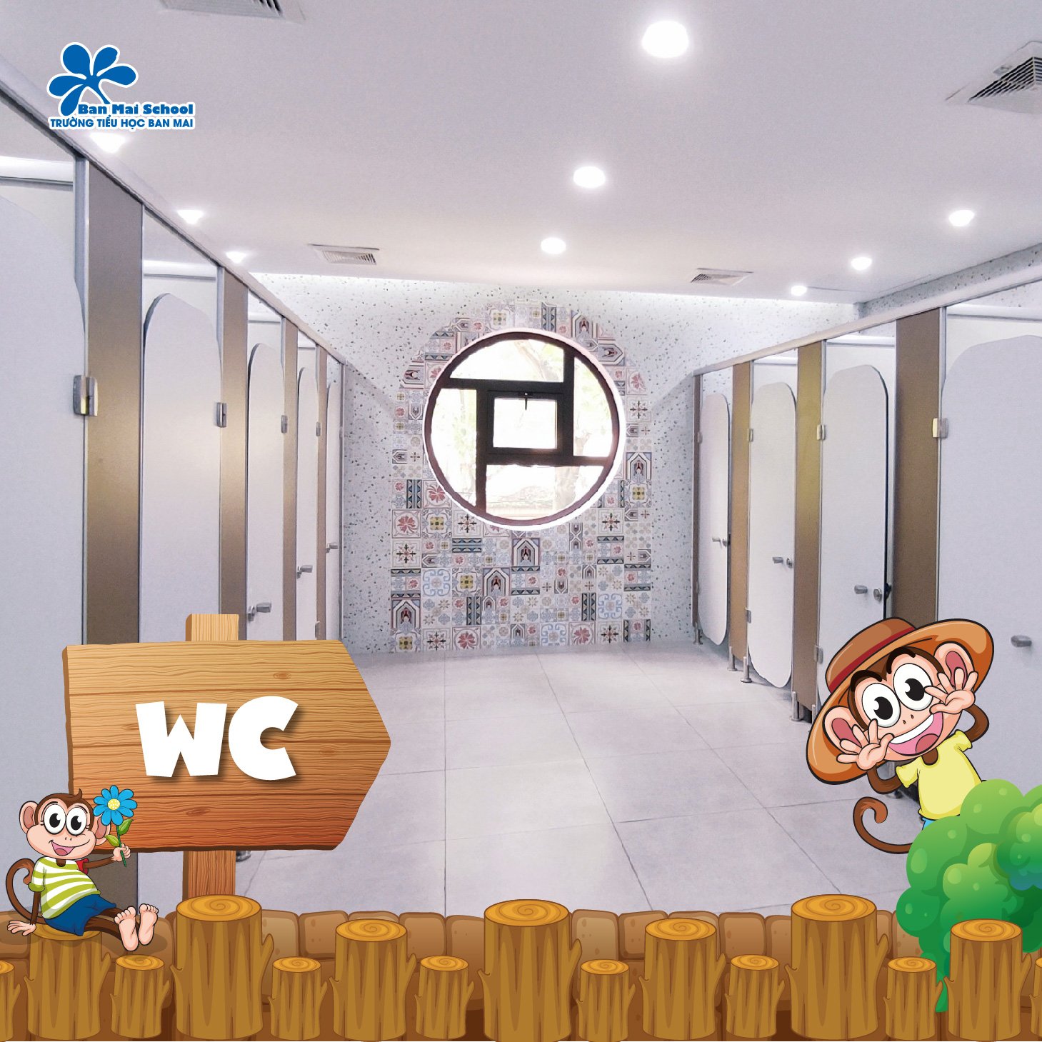 Nhà vệ sinh được thiết kế, xây dựng lại với nhiều tâm huyết, nỗ lực, cẩn thận trong từng khâu. Từ lựa chọn gạch lát nền, lát tường cũng như quy hoạch không gian đảm bảo luôn khô, thoáng, sạch, an toàn, tiện dụng và đủ ánh sáng. Chính giữa là một khuôn cửa sổ hình tròn như bông hoa mở ra đón gió thiên nhiên.