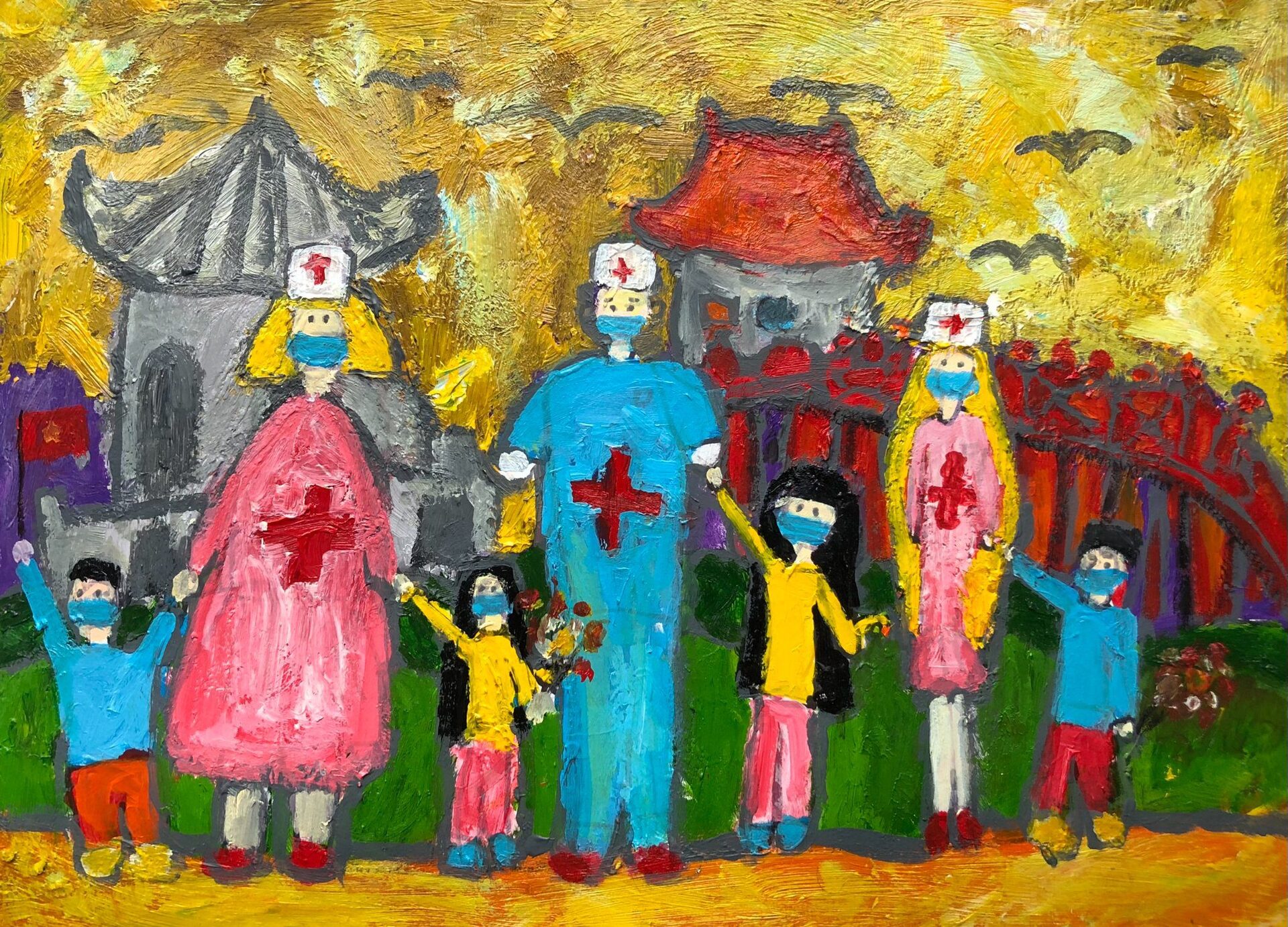 Bức tranh vẽ các y bác sĩ cùng các bạn nhỏ vui chơi quanh Hồ Gươm với tinh thần tươi vui sau khi chiến thắng dịch Covid-19 của cô học trò lớp 1 trường Tiểu học Ban Mai được nhiều người đánh giá cao khi mang góc nhìn tươi vui, tích cực tới người xem.