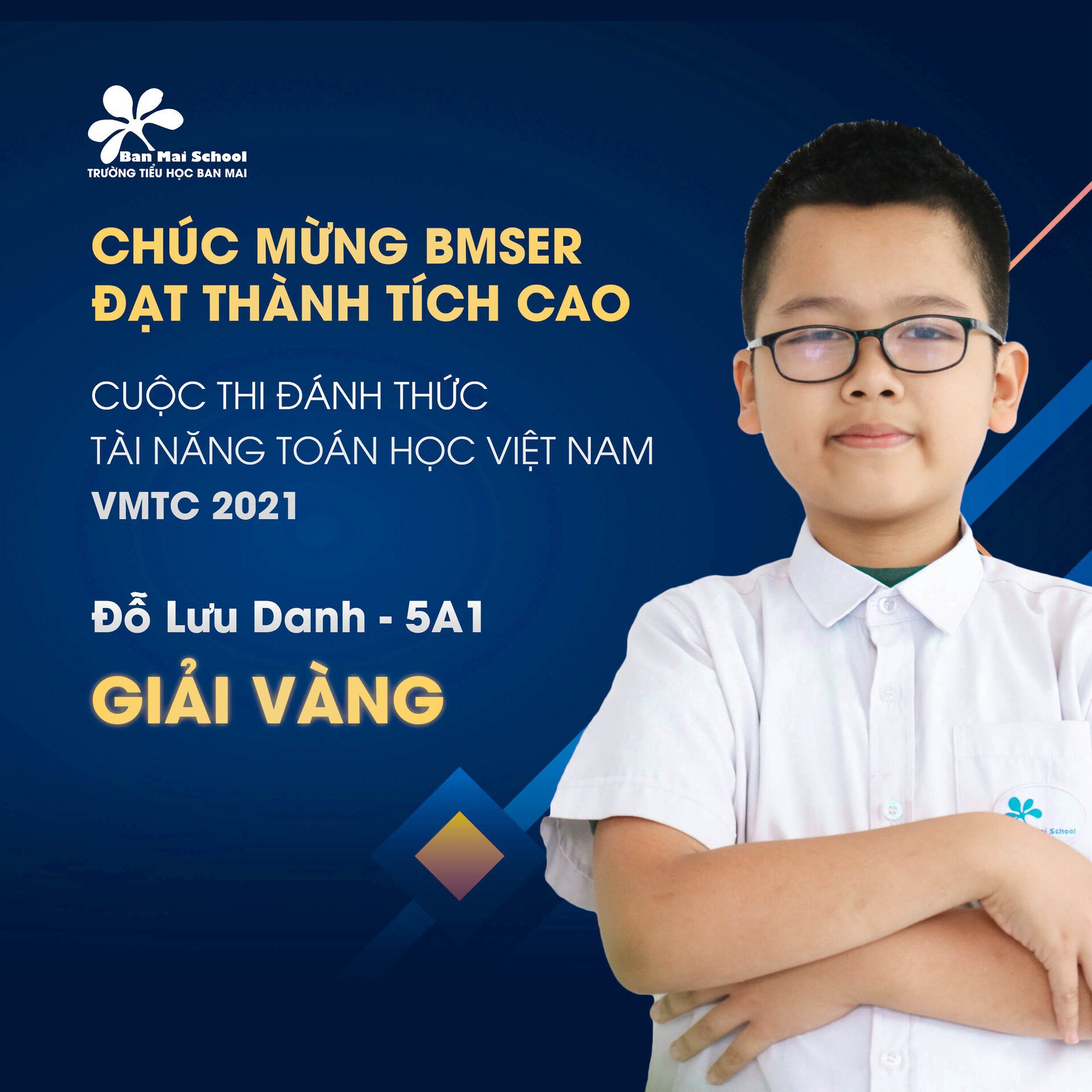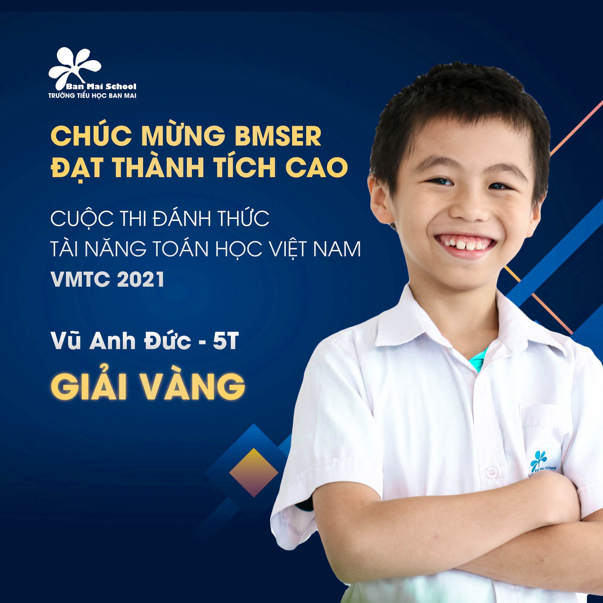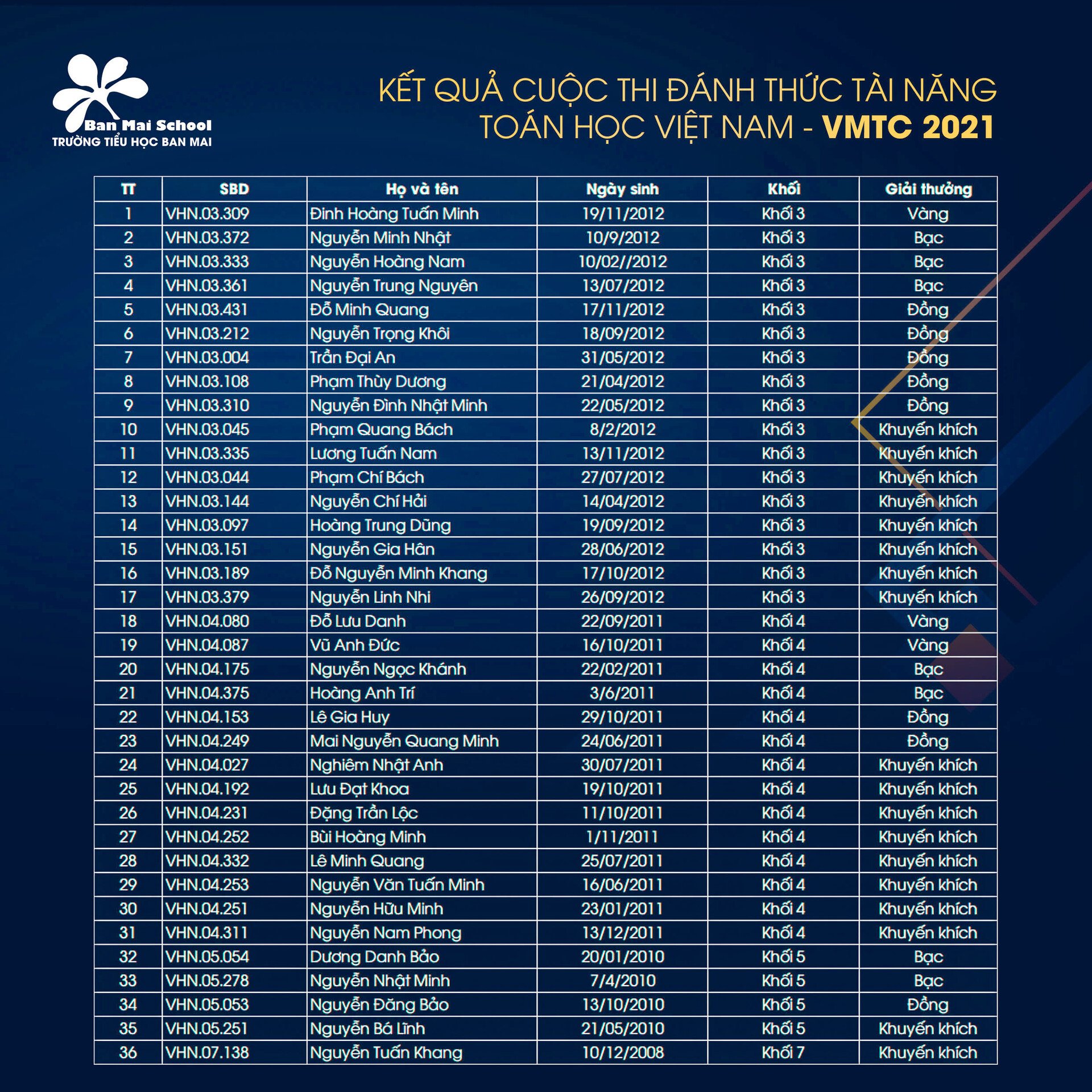 Chúc mừng 35 BMSers trường Tiểu học Ban Mai đạt thành tích cao tại kỳ thi Thách thức tài năng toán học Việt Nam (VMTC) 2021, với 3 giải Vàng, 7 giải Bạc, 8 giải Đồng, 17 giải Khuyến khích.