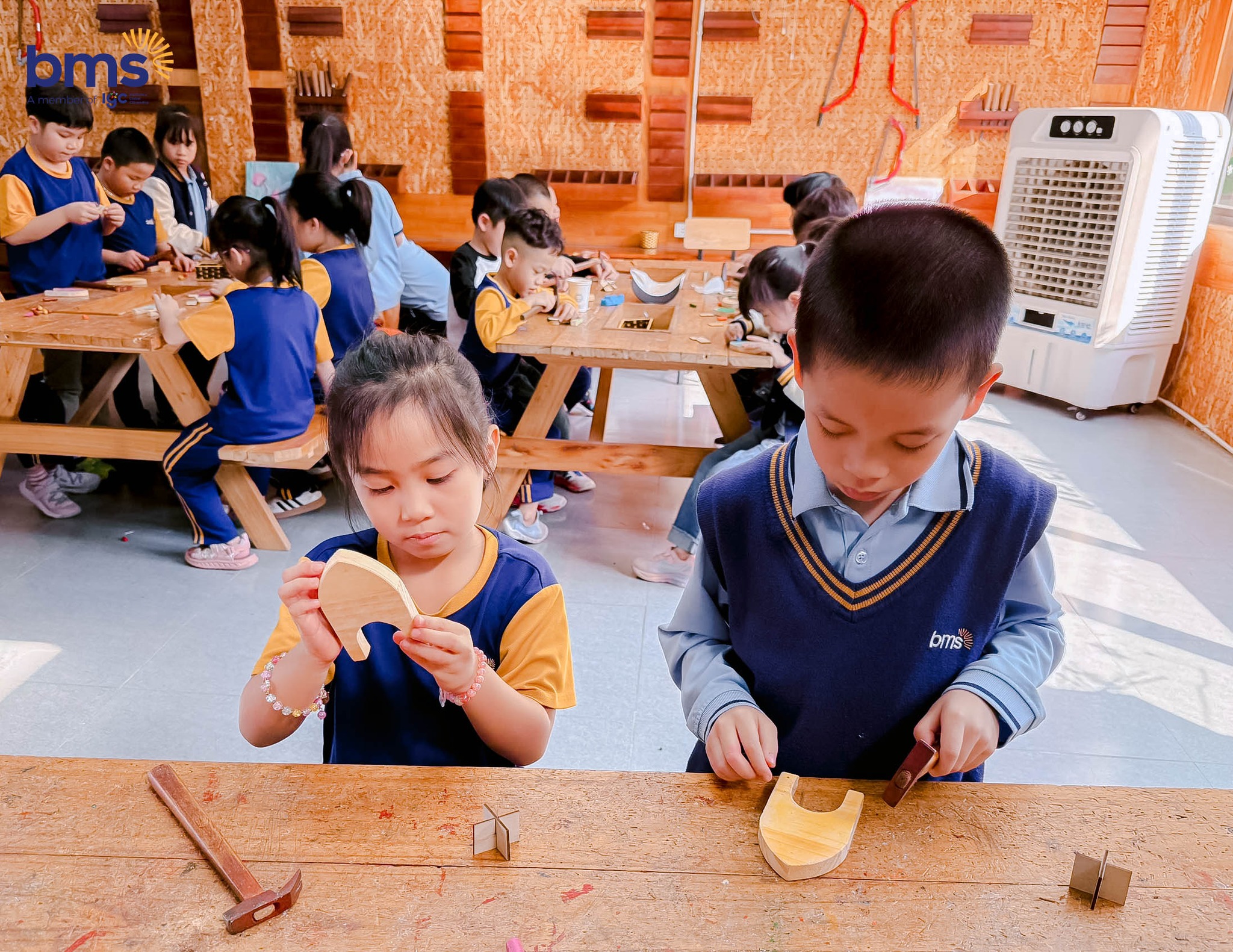 Trong xưởng mộc sáng tạo, BMSers được thử sức với những thao tác thủ công đầu tiên, tỉ mỉ tạo nên sản phẩm nhỏ xinh theo cách của riêng mình. Ở góc nghệ thuật, các con hào hứng làm tranh dân gian Đông Hồ - một trải nghiệm giúp các con chạm gần hơn tới nét đẹp văn hoá truyền thống và nuôi dưỡng niềm tự hào về bản sắc Việt.