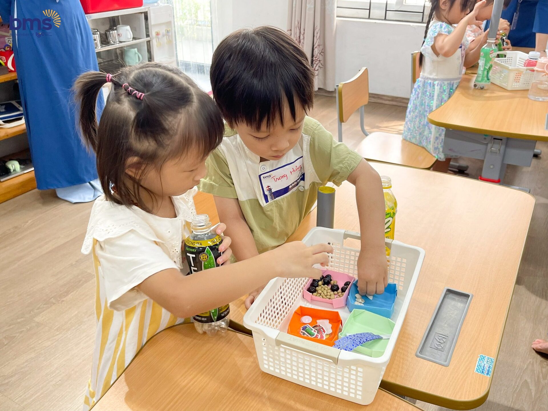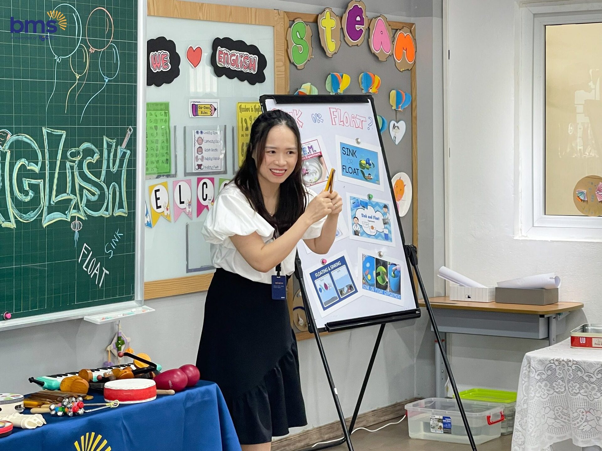 Tại hoạt động STEAM, với sự lồng ghép nghệ thuật, các bạn nhỏ đã vô cùng háo hức khi trải nghiệm tự làm đàn Maracas từ những vật dụng tái chế. Tiếp đó, các em còn được khám phá và hiểu về 2 định nghĩa chìm (sink) và nổi (float) bằng Tiếng Anh, thông qua việc tự khám phá kiến thức, chơi trò chơi để ôn tập, làm thí nghiệm theo nhóm, các em đã dễ dàng phân loại đồ vật chìm và nổi.