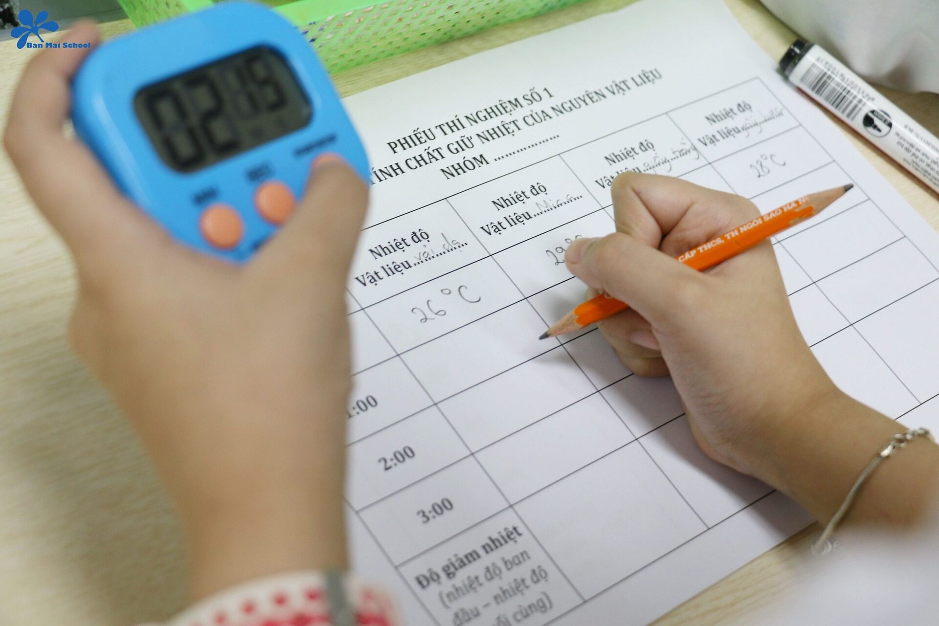 Mỗi nhóm được chia 5 cốc nhựa, trong đó 1 cốc sử dụng làm cốc đối chứng, 4 cốc còn lại đựng 4 nguyên liệu nhóm đã lựa chọn. Mỗi bạn phân công đảm nhận một nhiệm vụ: Bạn sử dụng đất nặn cố định nhiệt kế vào các cốc, người bấm đồng hồ, ghi nhiệt độ ban đầu ở các cốc vào phiếu theo dõi…