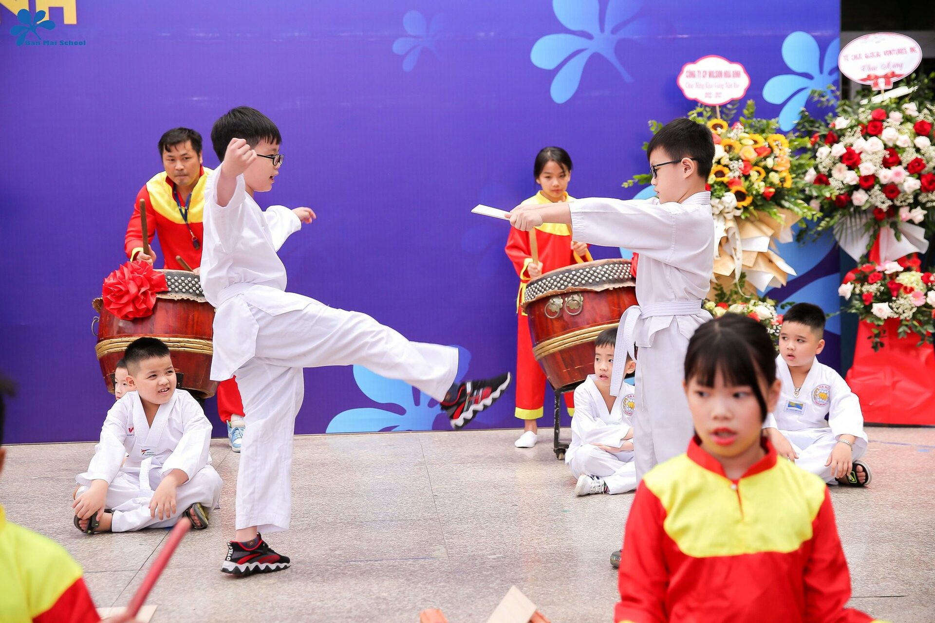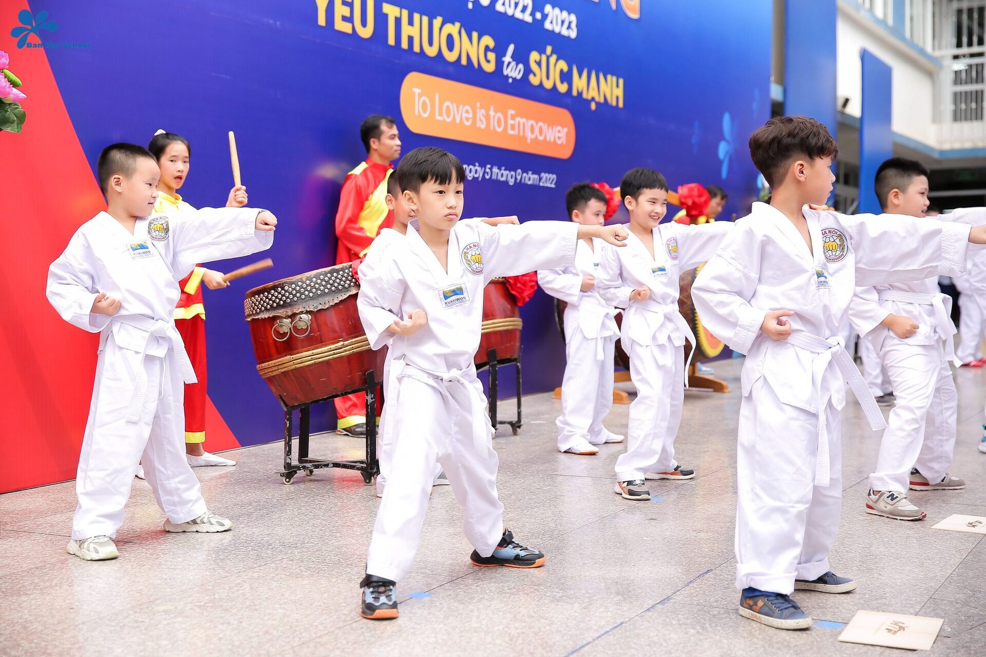 Chủ đề: “Yêu thương tạo sức mạnh” đã được thầy trò trường Tiểu học Ban Mai thể hiện rõ nét và ấn tượng qua phần trình diễn kết hợp giữa Trống hội – Võ thuật – múa hát “Ban Mai trường em”.
