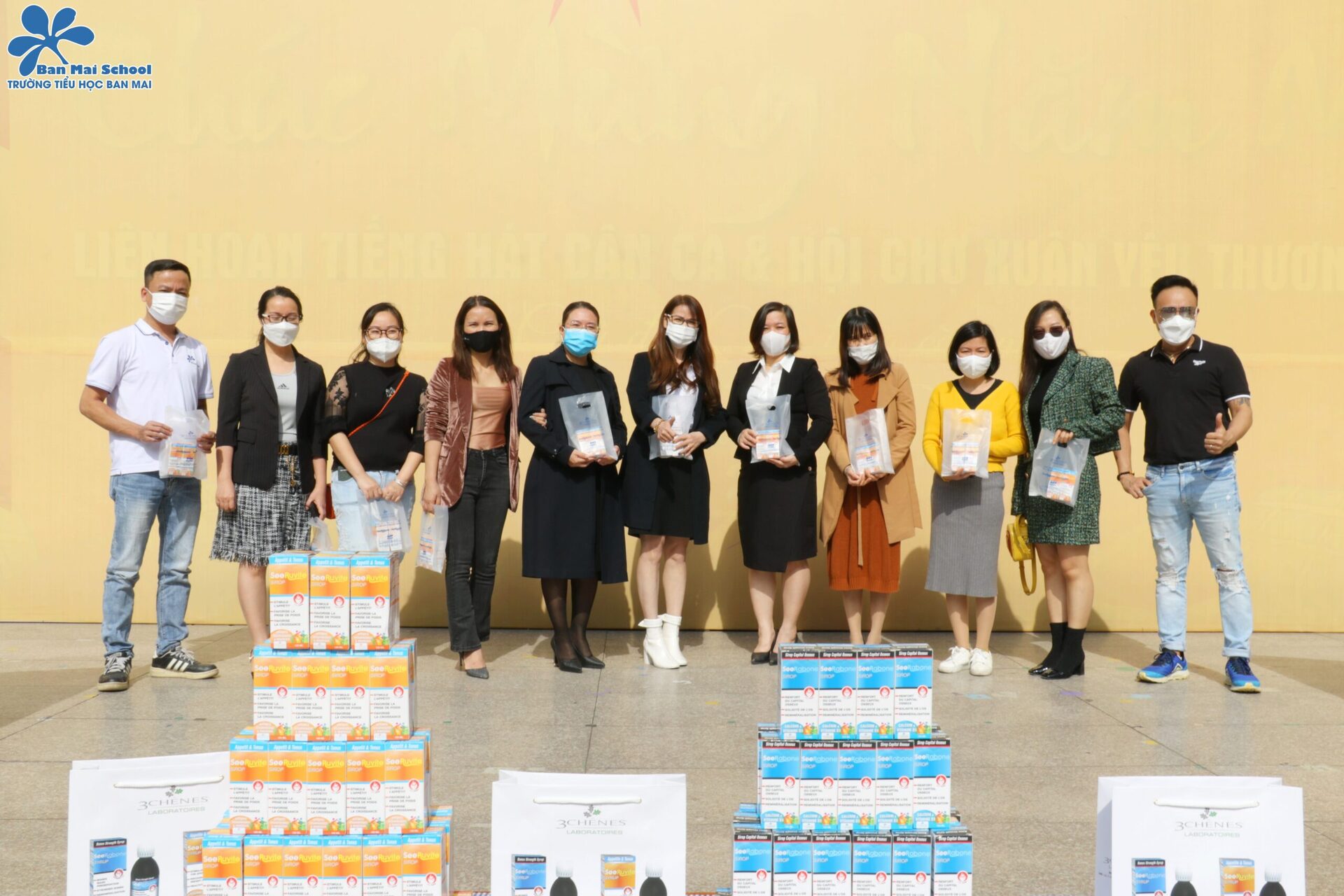 Sáng 13/11, BGH phối hợp với HĐCMHS trường Ban Mai và hãng dược phẩm Les 3 Chenes Pháp, CTCP TMDV & XNK Hoàng Thành trao tặng 200 suất quà cho các con.