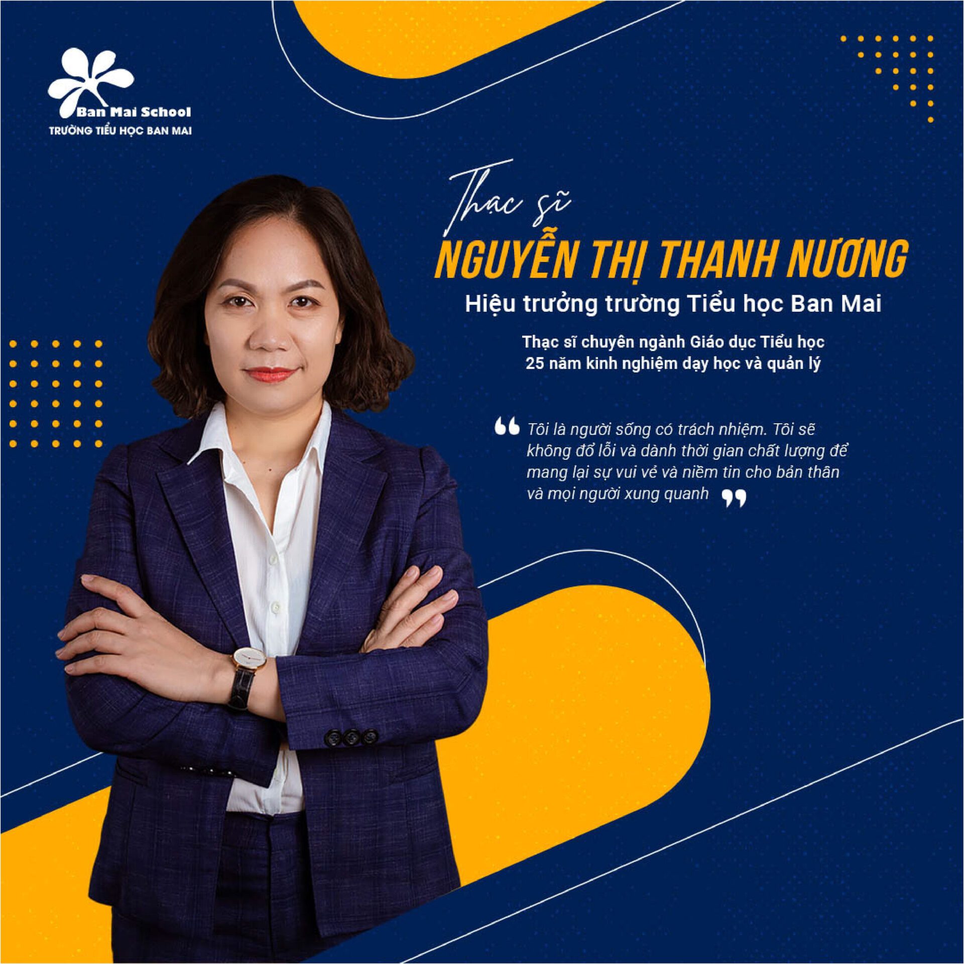 Chúc Thạc sĩ Nguyễn Thị Thanh Nương hoàn thành xuất sắc nhiệm vụ, luôn vững tay chèo đưa con tàu Ban Mai vượt qua những mục tiêu và thách thức của thế kỷ 21, gặt hái những thành tựu vẻ vang và kiến tạo nên những thế hệ BMSers với tâm biết ơn, trí ngời sáng.