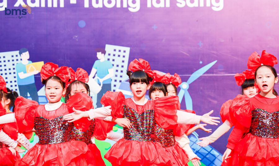 Trong không khí tưng bừng ấy, BMSers đã trình diễn những bộ trang phục thời trang tái chế đầy sáng tạo và độc đáo. Từ những vật liệu tưởng chừng đơn giản, các em đã biến hóa thành những tác phẩm nghệ thuật, vừa đẹp mắt vừa gửi gắm thông điệp sống xanh, bảo vệ môi trường.